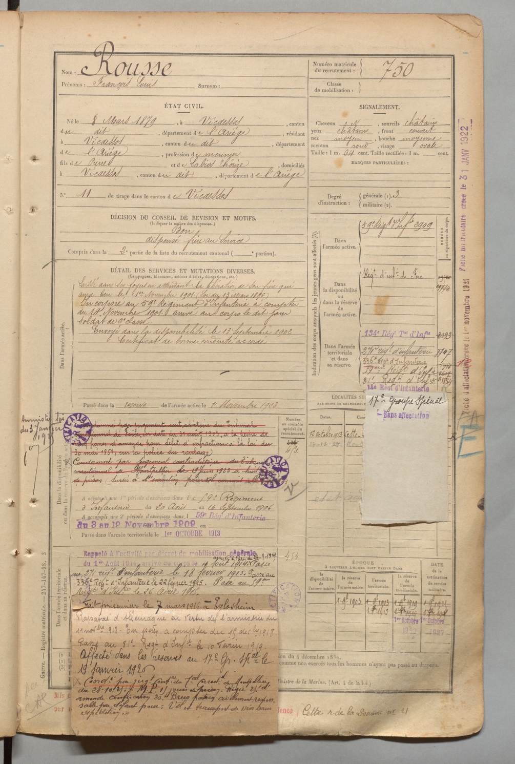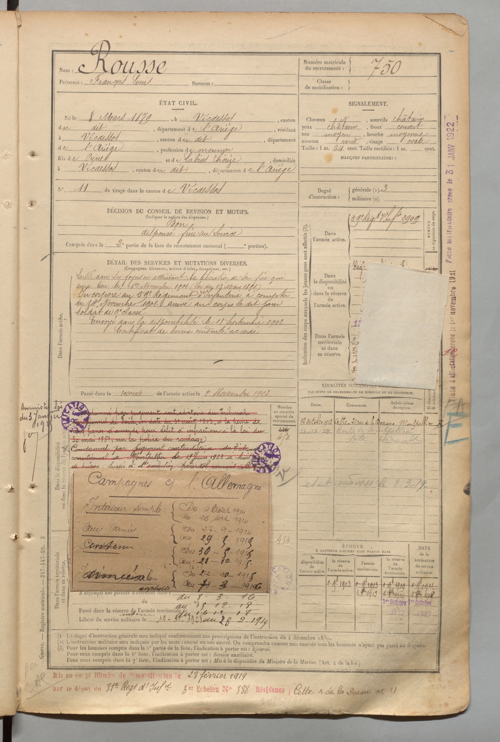 | Rousse | François Louis | FOIX | 1 R 457 | 1899 | Vicdessos | Vicdessos | 750 |