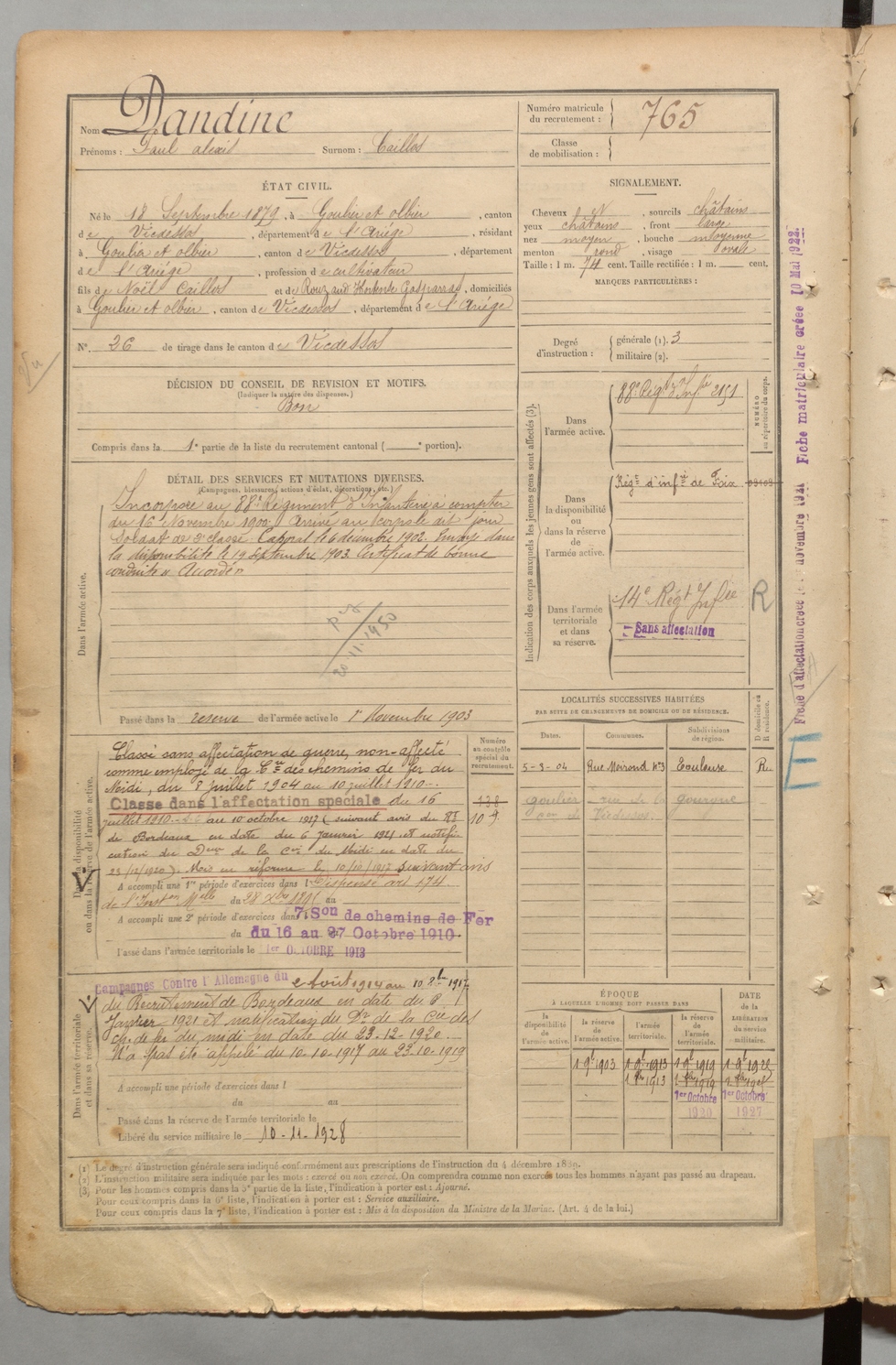 | Dandine | Paul Alexis dit Caillos | FOIX | 1 R 457 | 1899 | Goulier-Olbier | Goulier-Olbier | 765 |