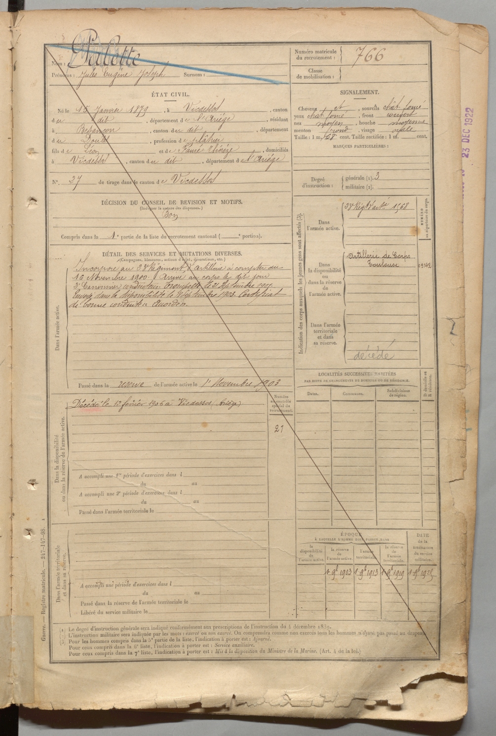 | Palette | Jules Eugène Joseph | FOIX | 1 R 457 | 1899 | Vicdessos | Besançon | 766 |