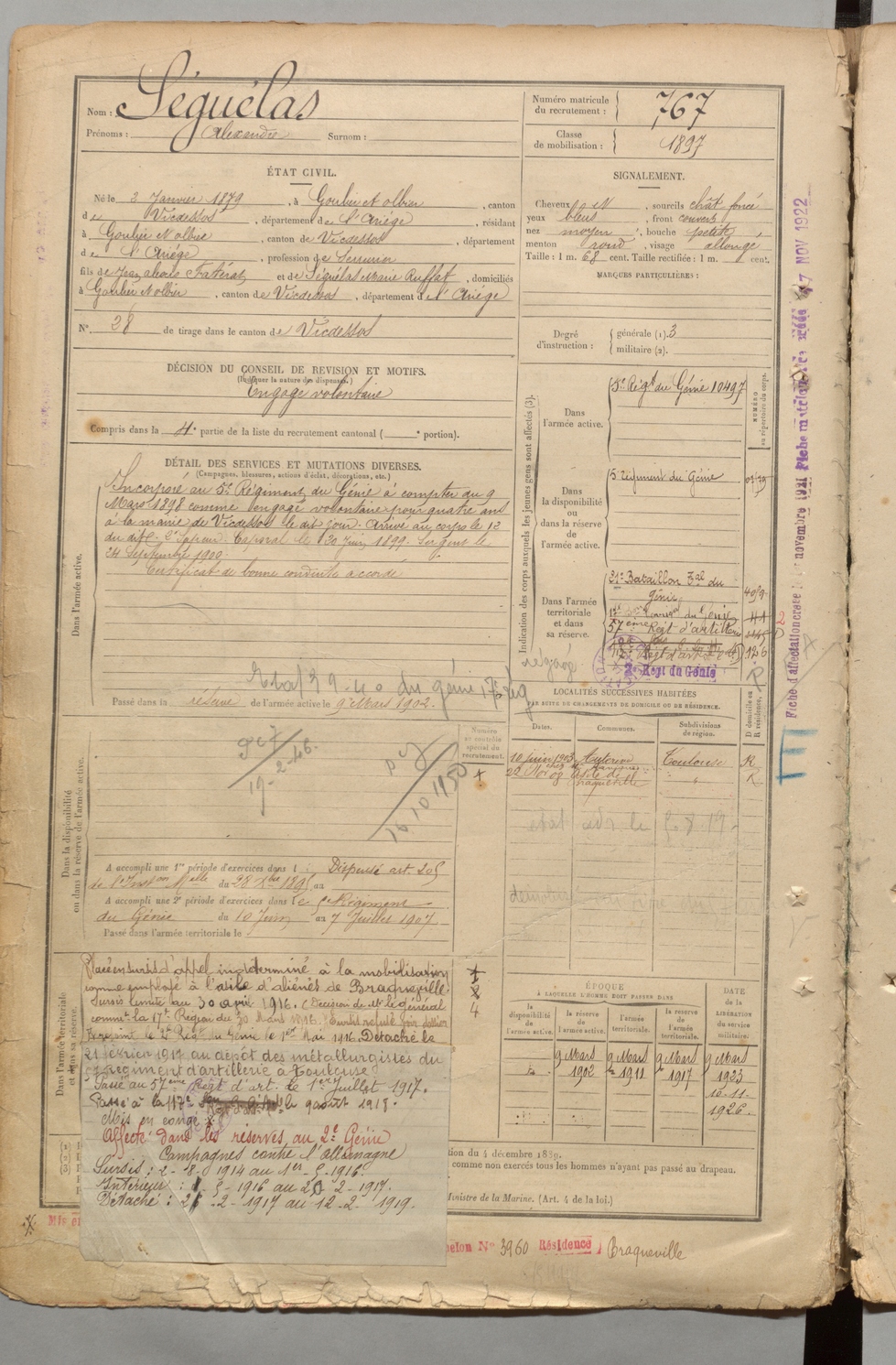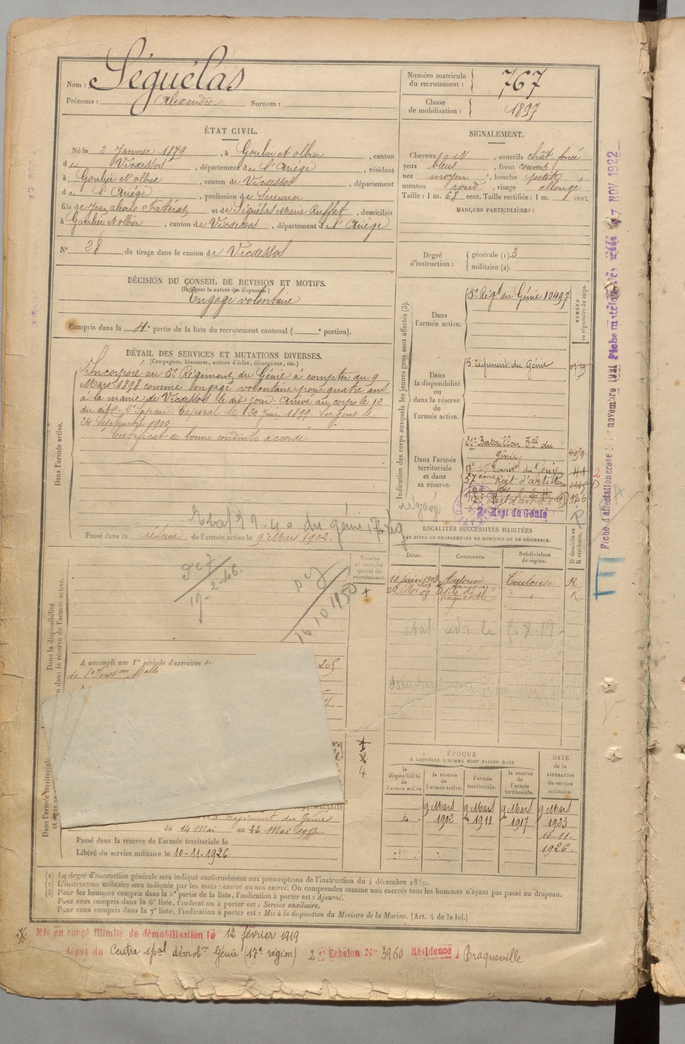 | Séguélas | Alexandre | FOIX | 1 R 457 | 1899 | Goulier-Olbier | Goulier-Olbier | 767 |