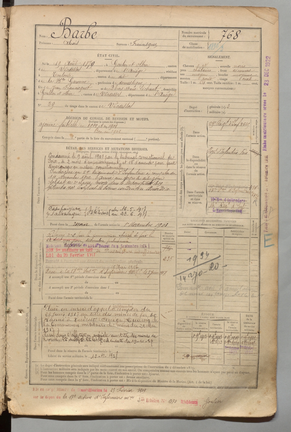 | Barbe | Alexis dit Francisquet | FOIX | 1 R 457 | 1899 | Goulier-Olbier | Toulouse | 768 |