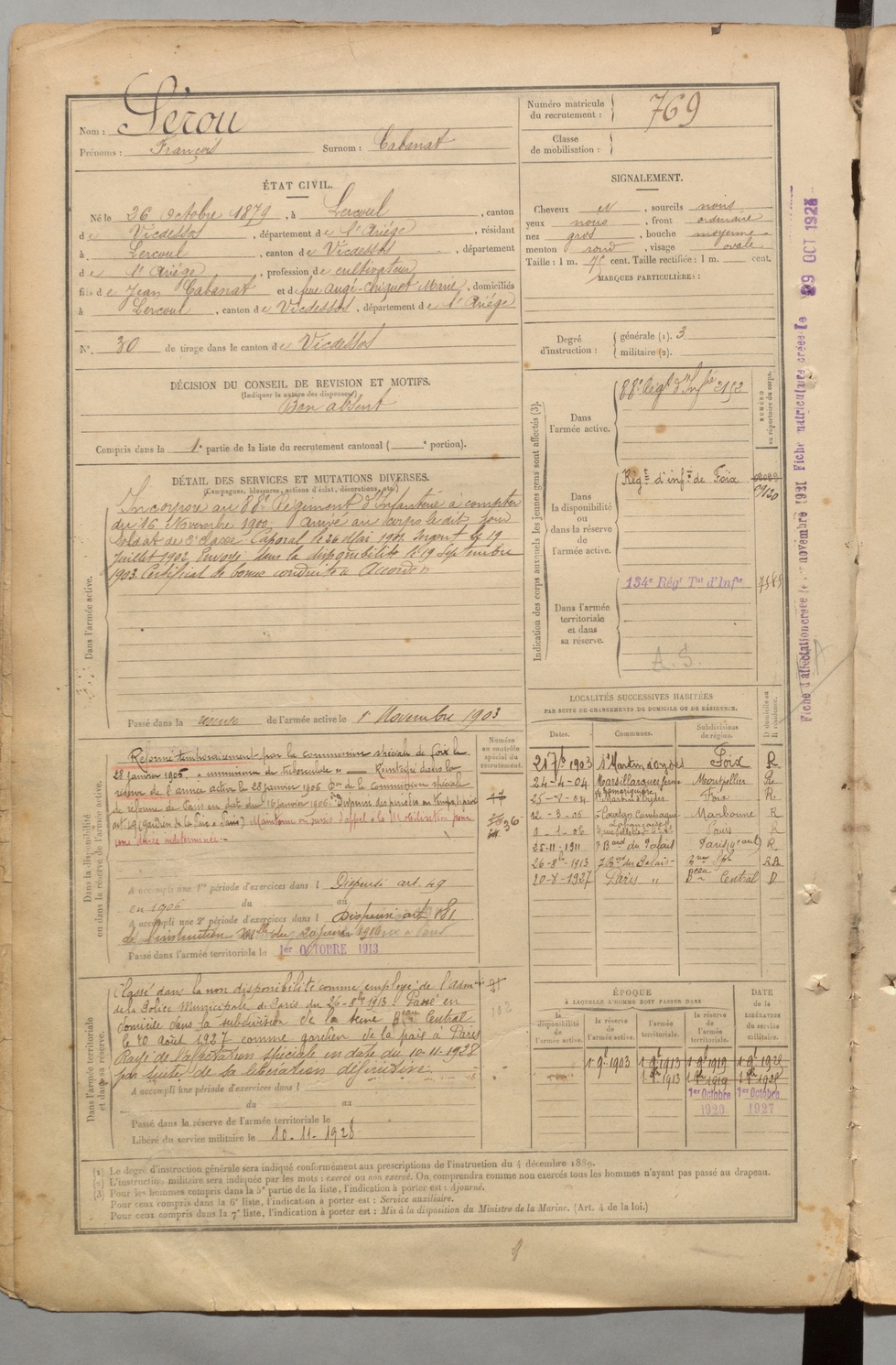 | Sérou | François dit Cabanat | FOIX | 1 R 457 | 1899 | Lercoul | Lercoul | 769 |