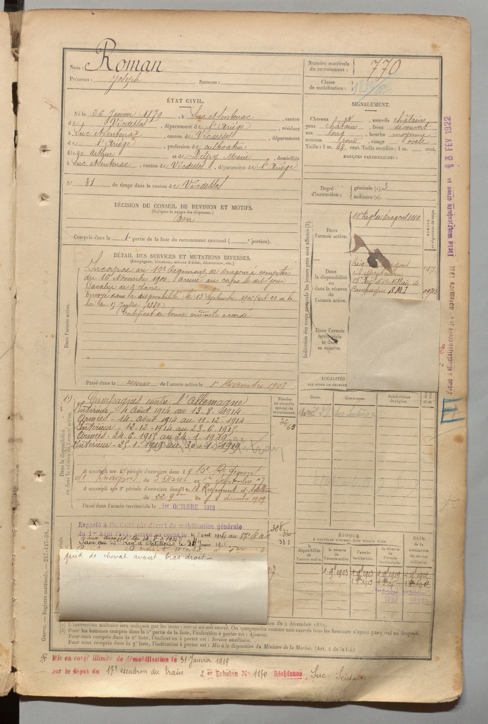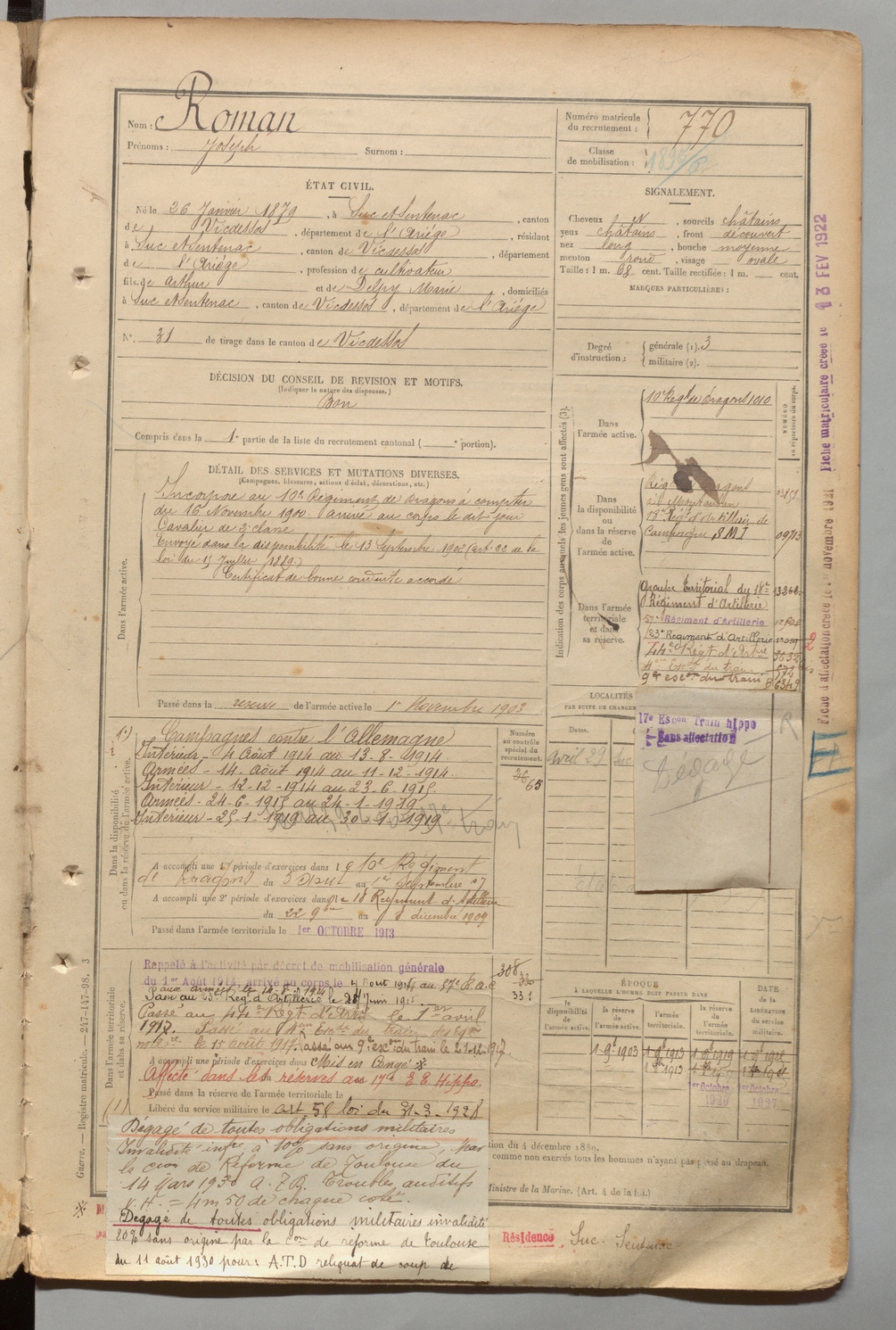 | Roman | Joseph | FOIX | 1 R 457 | 1899 | Suc-et-Sentenac | Suc-et-Sentenac | 770 |