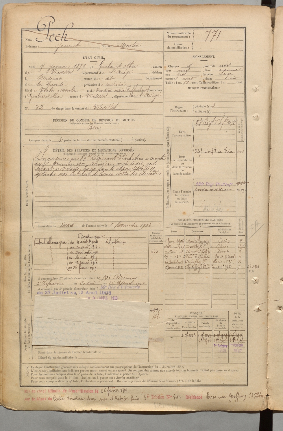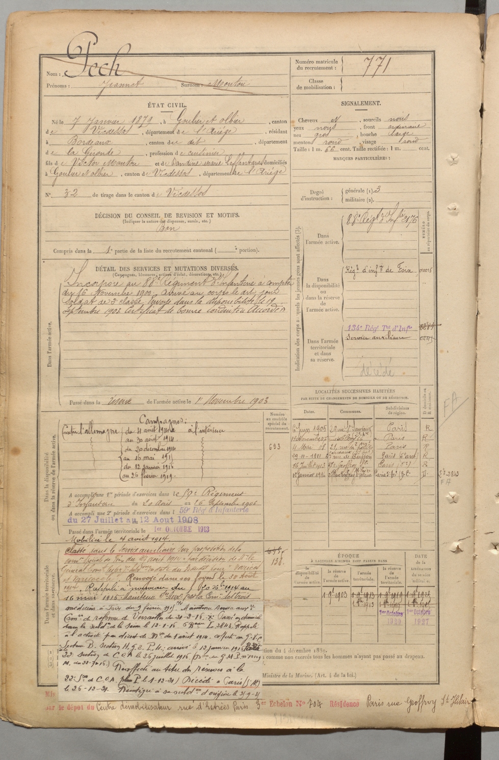| Pech | Jeannet dit Moutou | FOIX | 1 R 457 | 1899 | Goulier-Olbier | Bordeaux | 771 |