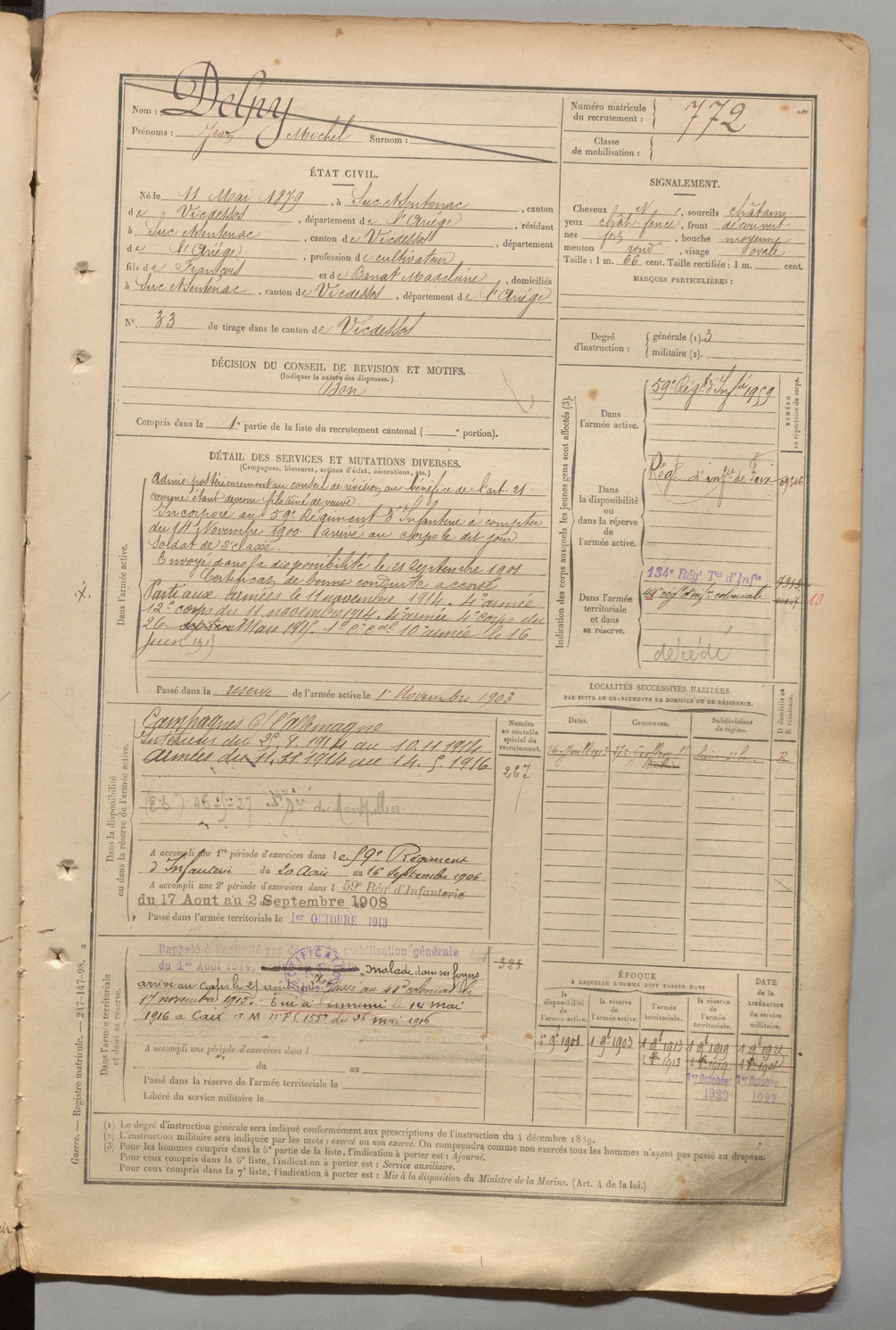 | Delpy | Jean Michel | FOIX | 1 R 457 | 1899 | Suc-et-Sentenac | Suc-et-Sentenac | 772 |