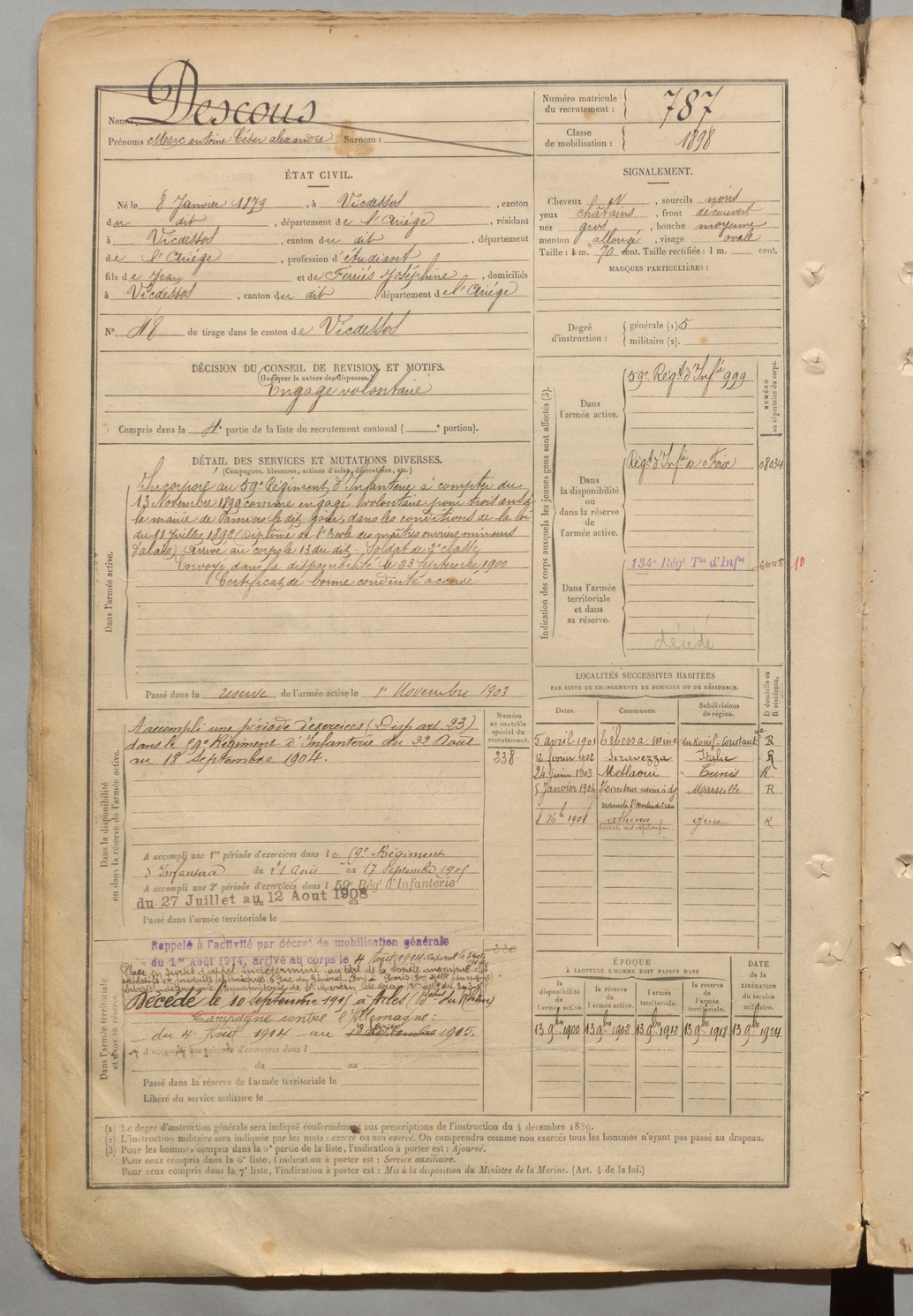 | Descous | Marc Antoine César Alexandre | FOIX | 1 R 457 | 1899 | Vicdessos | Vicdessos | 787 |