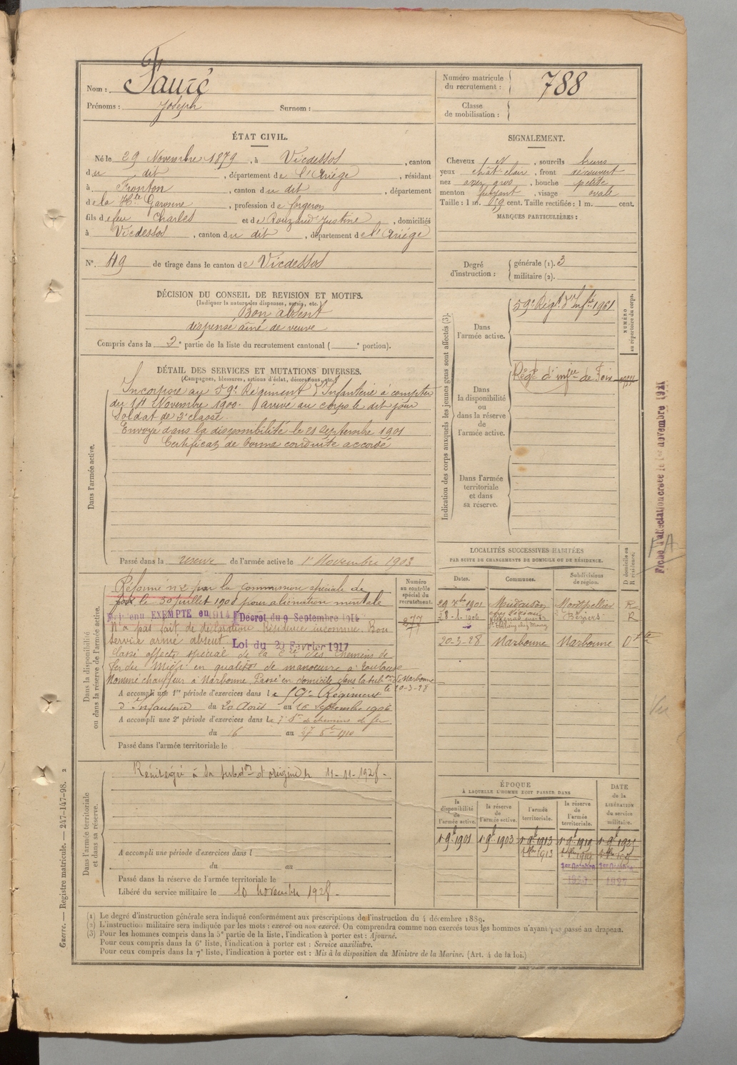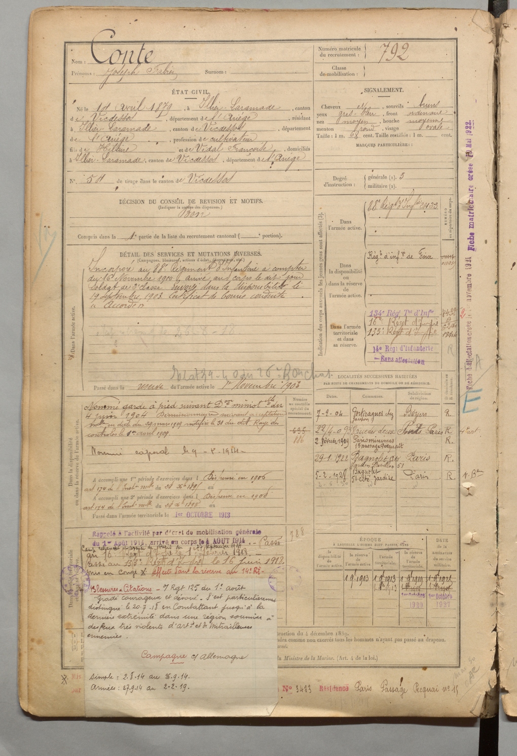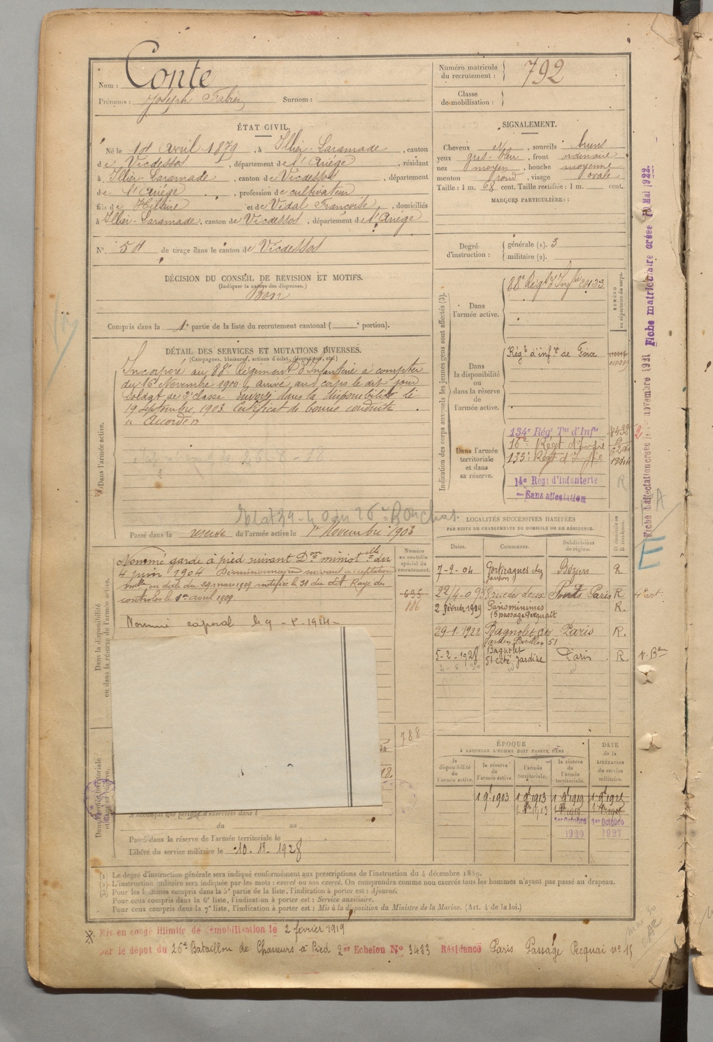 | Conte | Joseph Fabien | FOIX | 1 R 457 | 1899 | Illier-Laramade | Illier-Laramade | 792 |