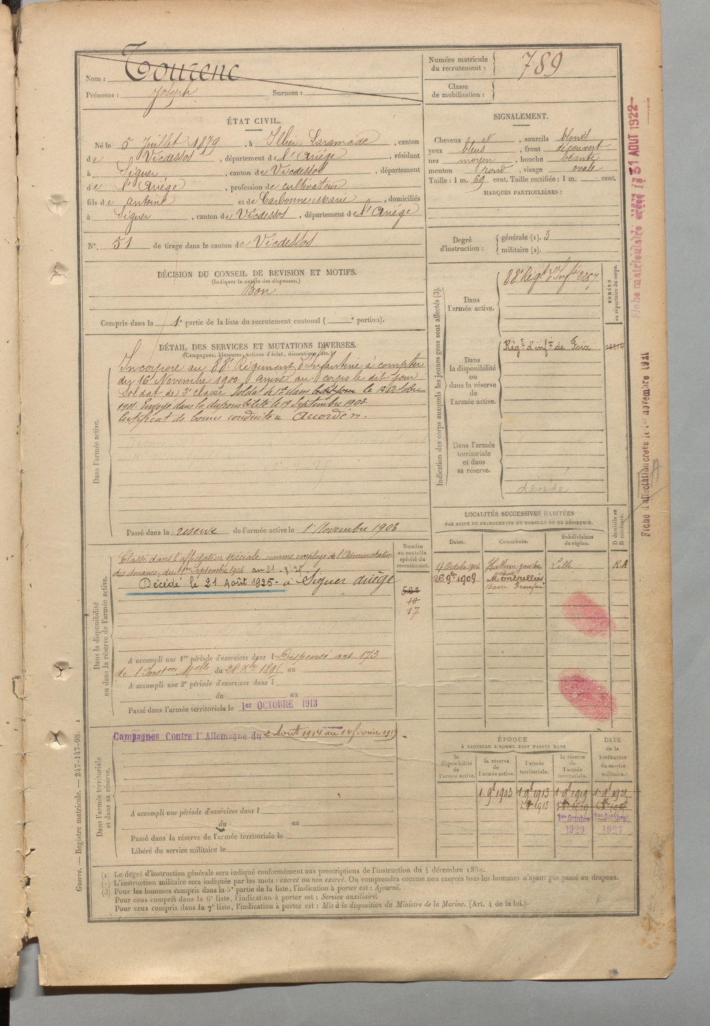 | Tourenc | Joseph | FOIX | 1 R 457 | 1899 | Illier-Laramade | Siguer | 789 |