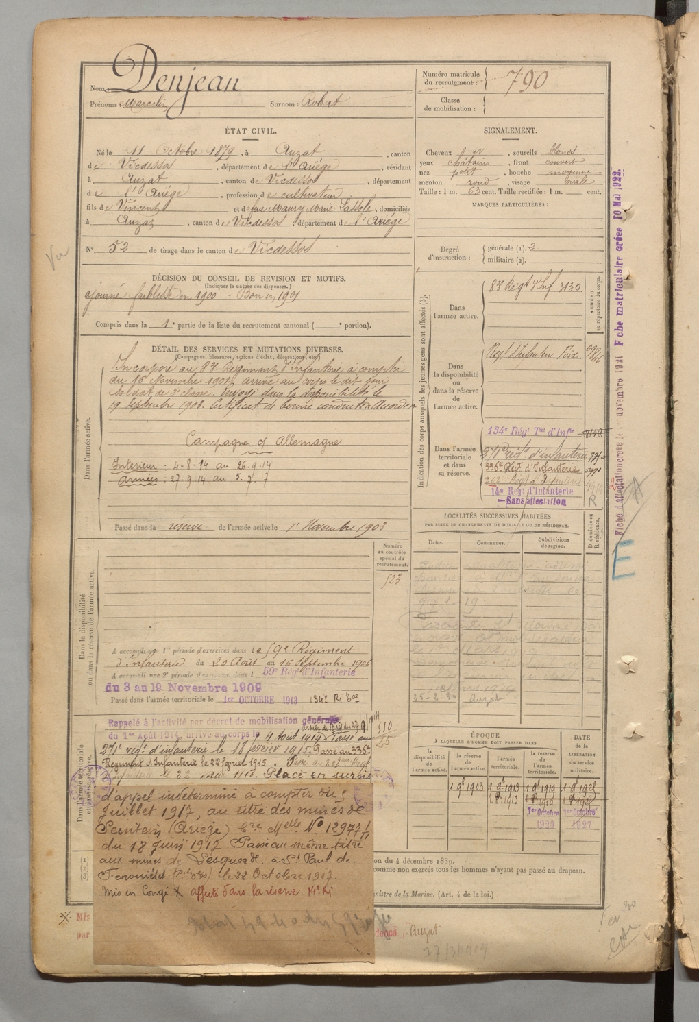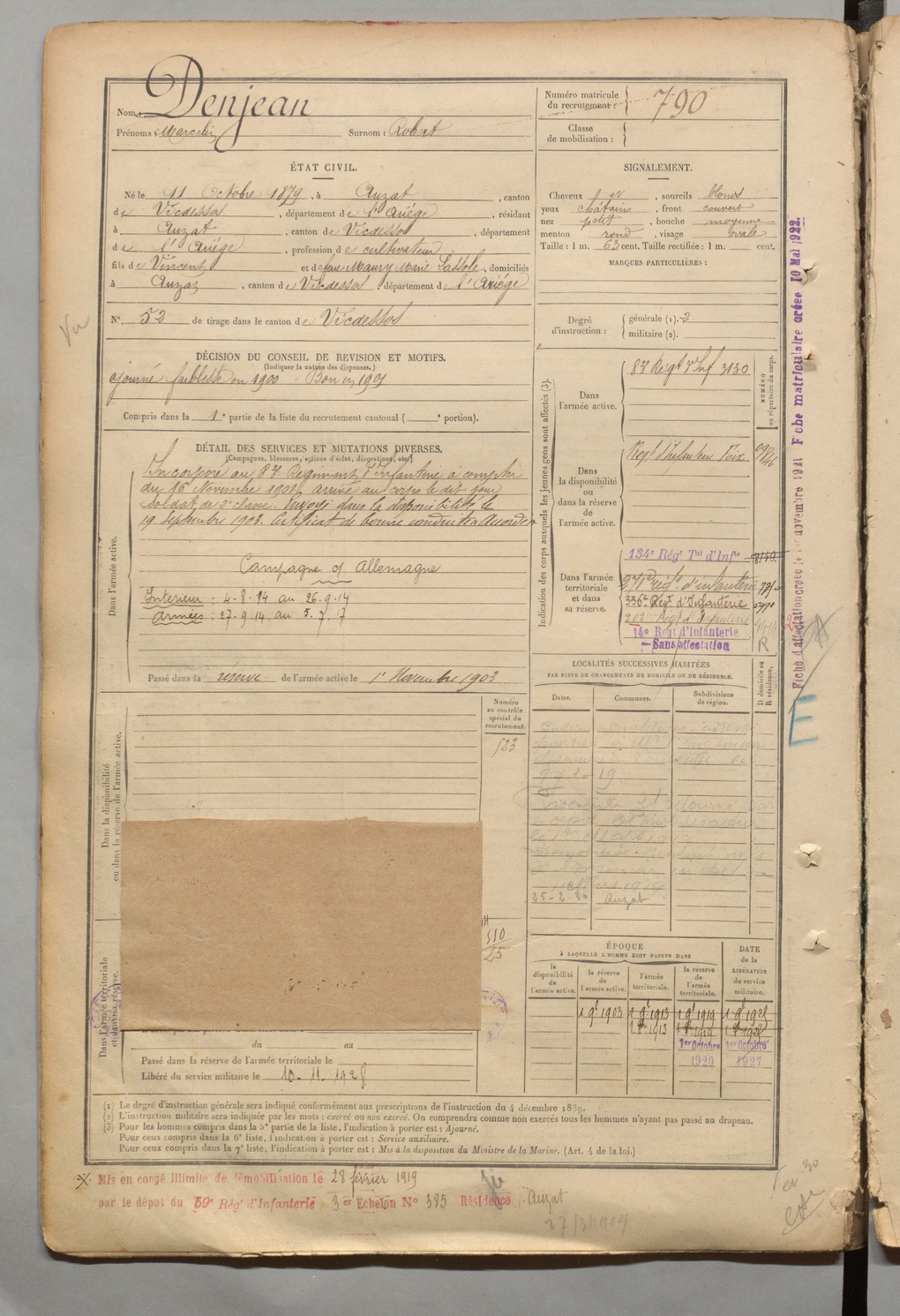 | Denjean | Marcelin dit Robert | FOIX | 1 R 457 | 1899 | Auzat | Auzat | 790 |