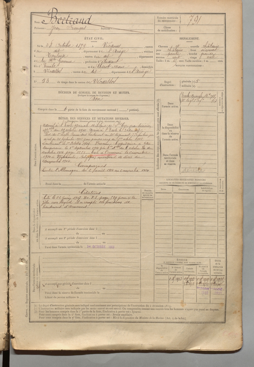 | Bertrand | Jean François | FOIX | 1 R 457 | 1899 | Vicdessos | Toulouse | 791 |