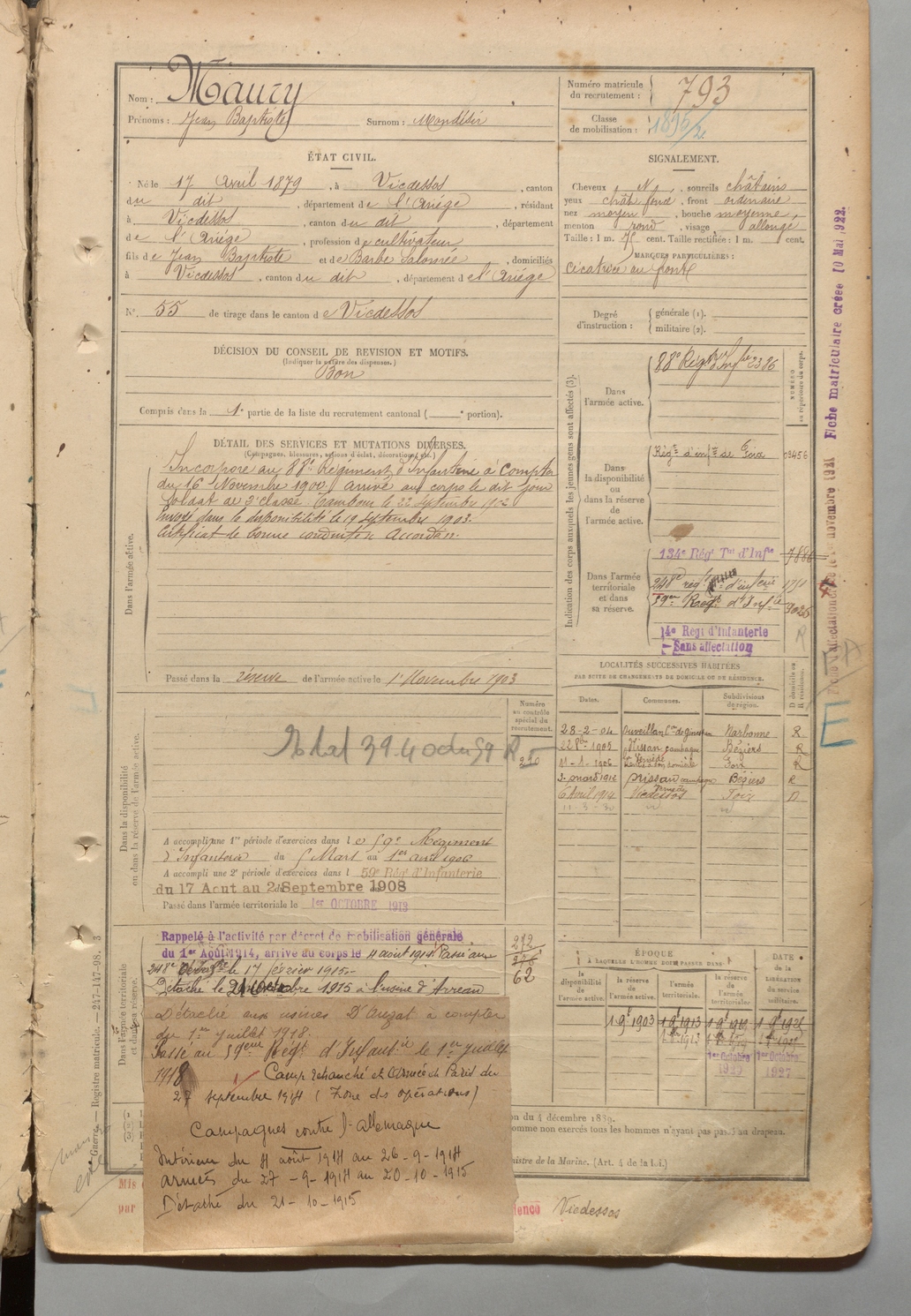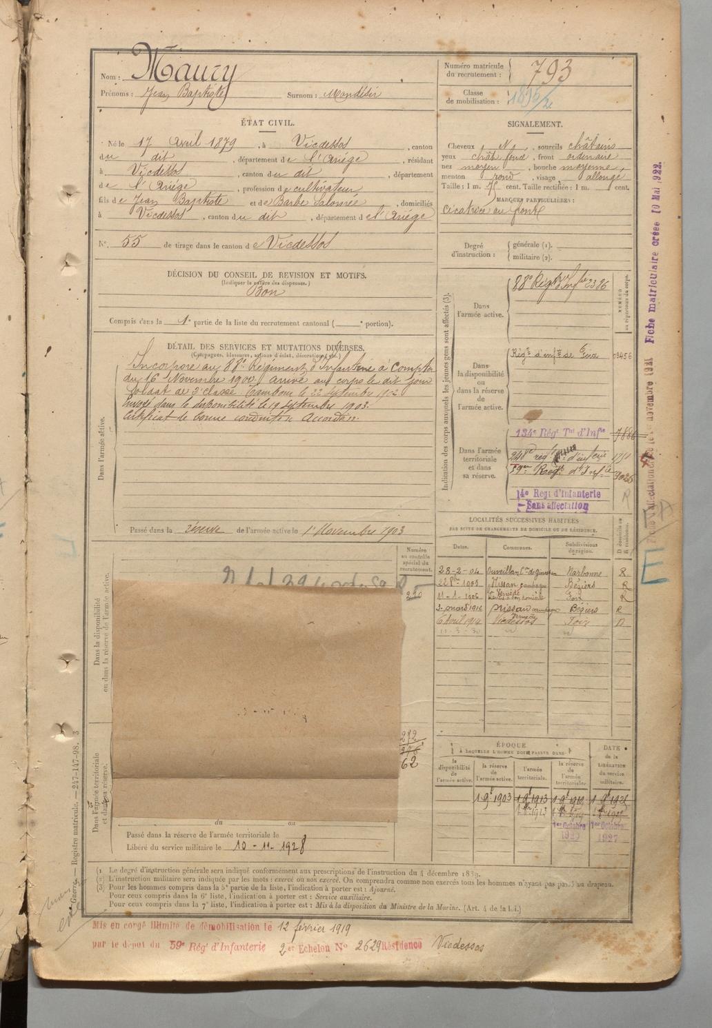 | Maury | Jean Baptiste dit Mondésir | FOIX | 1 R 457 | 1899 | Vicdessos | Vicdessos | 793 |