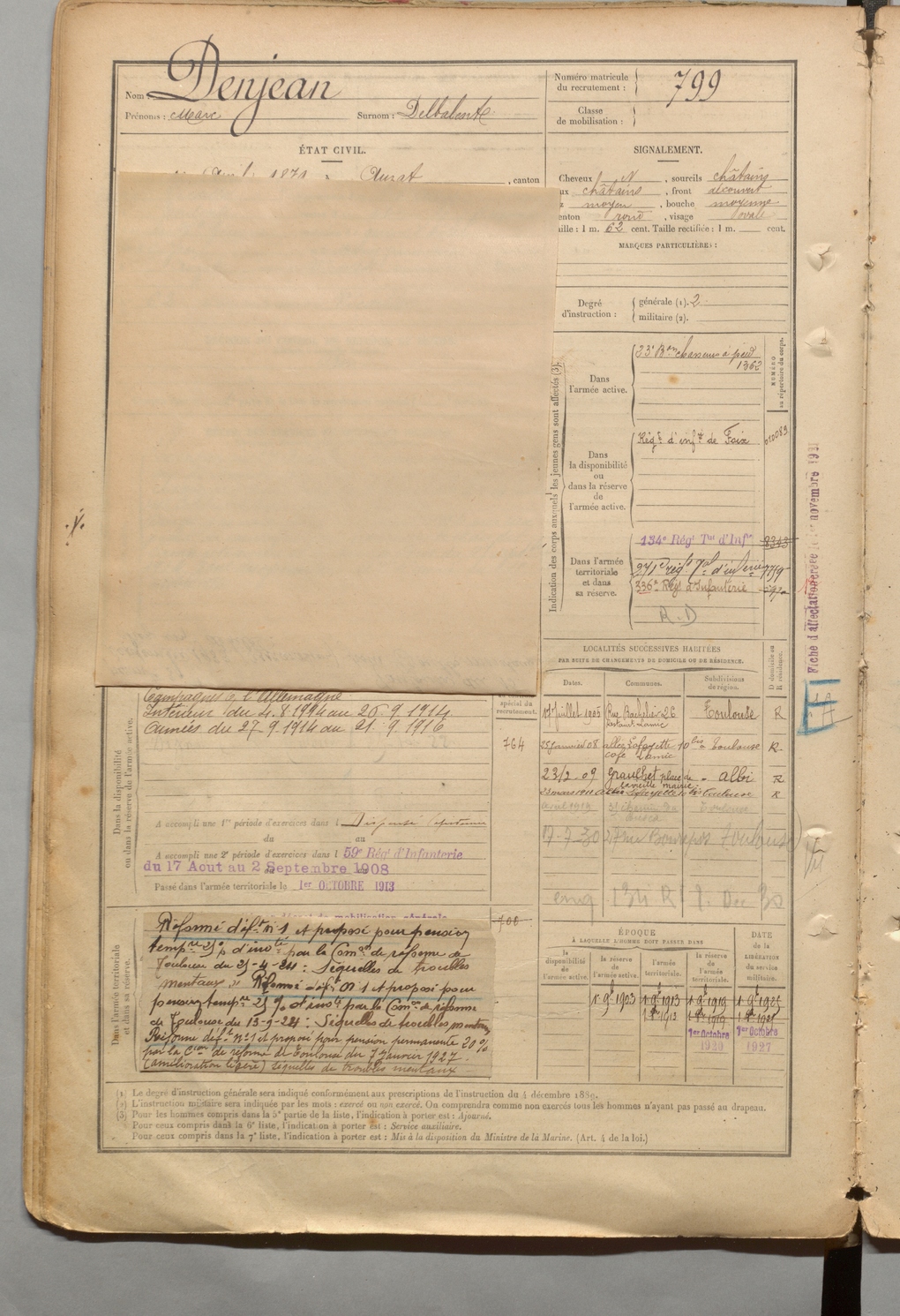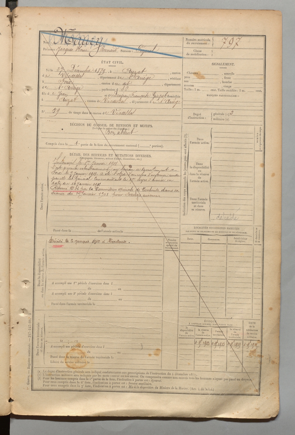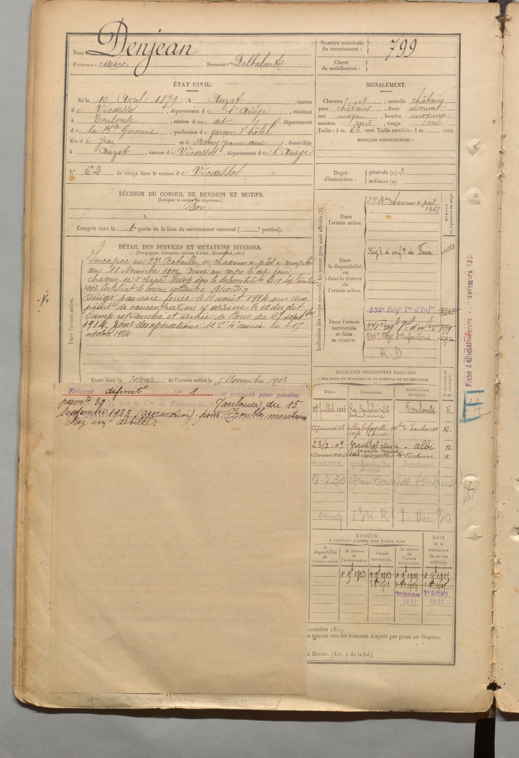 | Denjean | Marc dit Delbalente | FOIX | 1 R 457 | 1899 | Auzat | Toulouse | 799 |