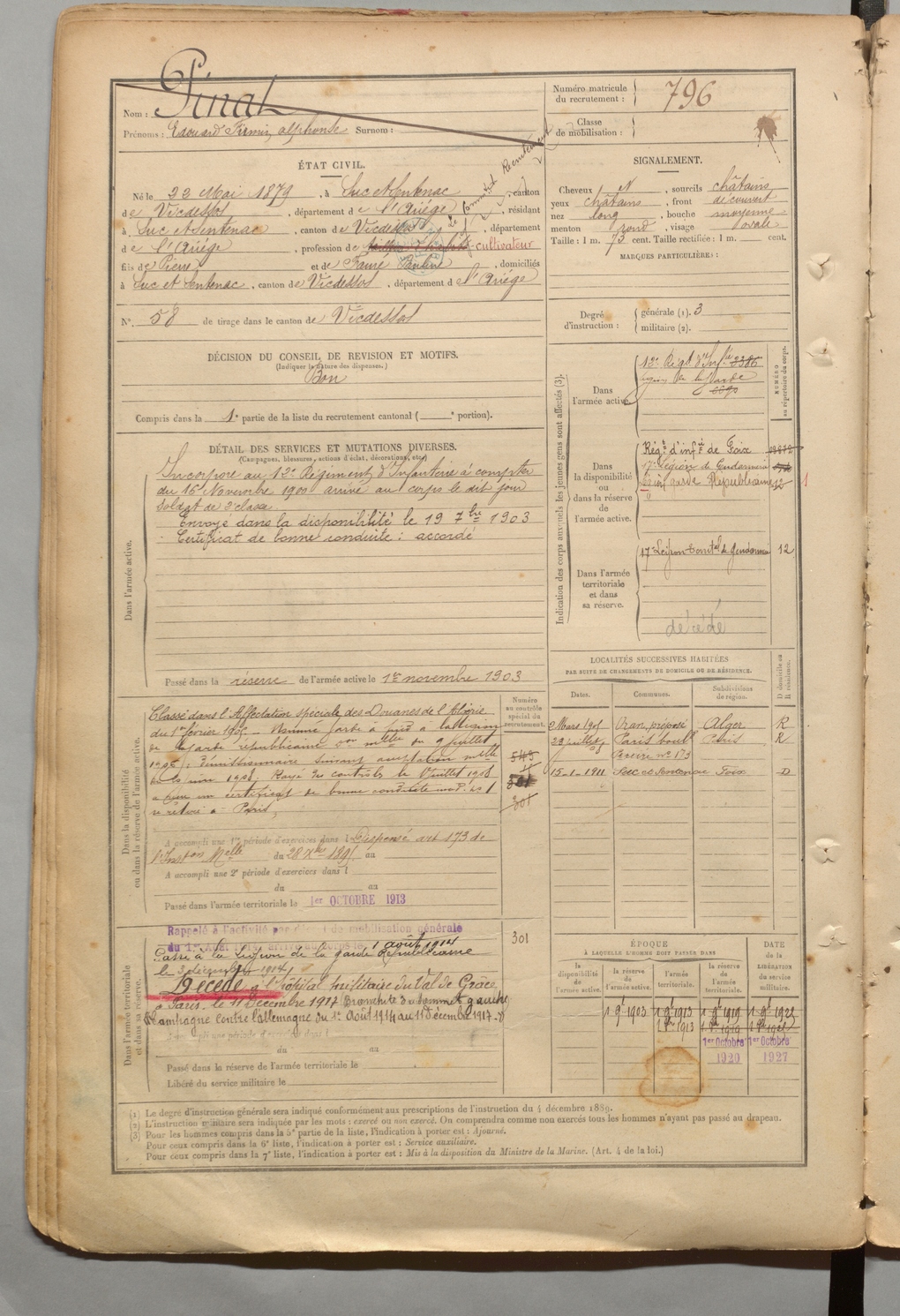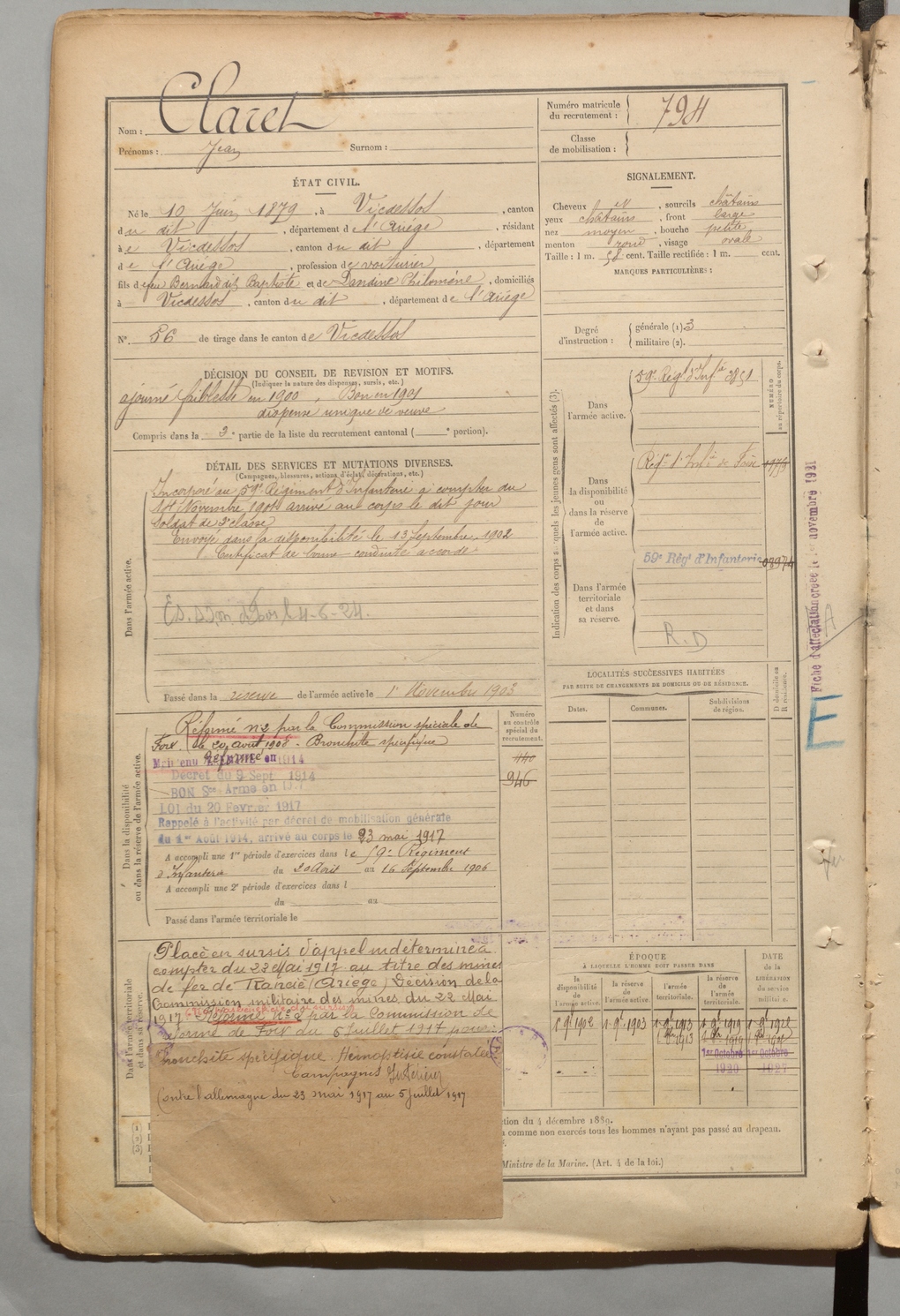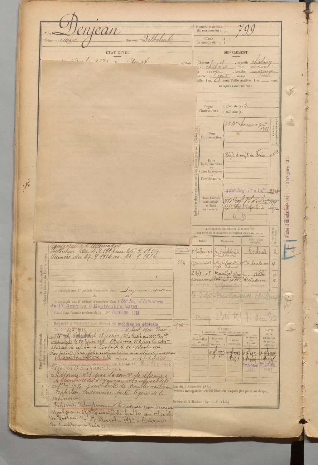 | Denjean | Marc dit Delbalente | FOIX | 1 R 457 | 1899 | Auzat | Toulouse | 799 |