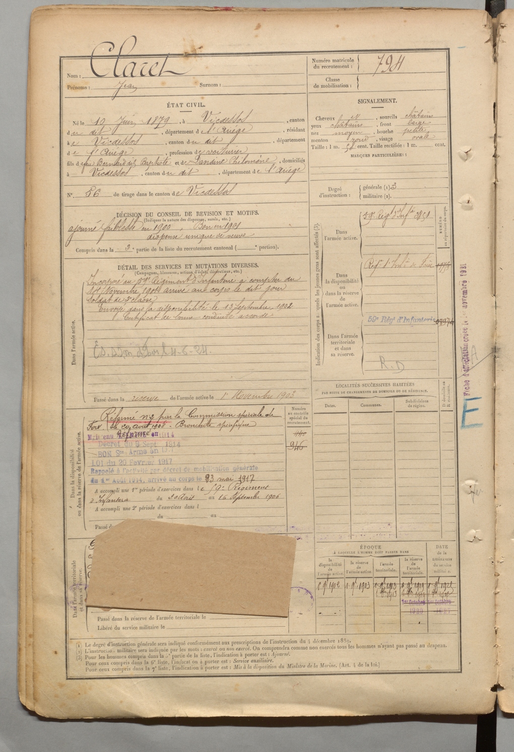 | Claret | Jean | FOIX | 1 R 457 | 1899 | Vicdessos | Vicdessos | 794 |