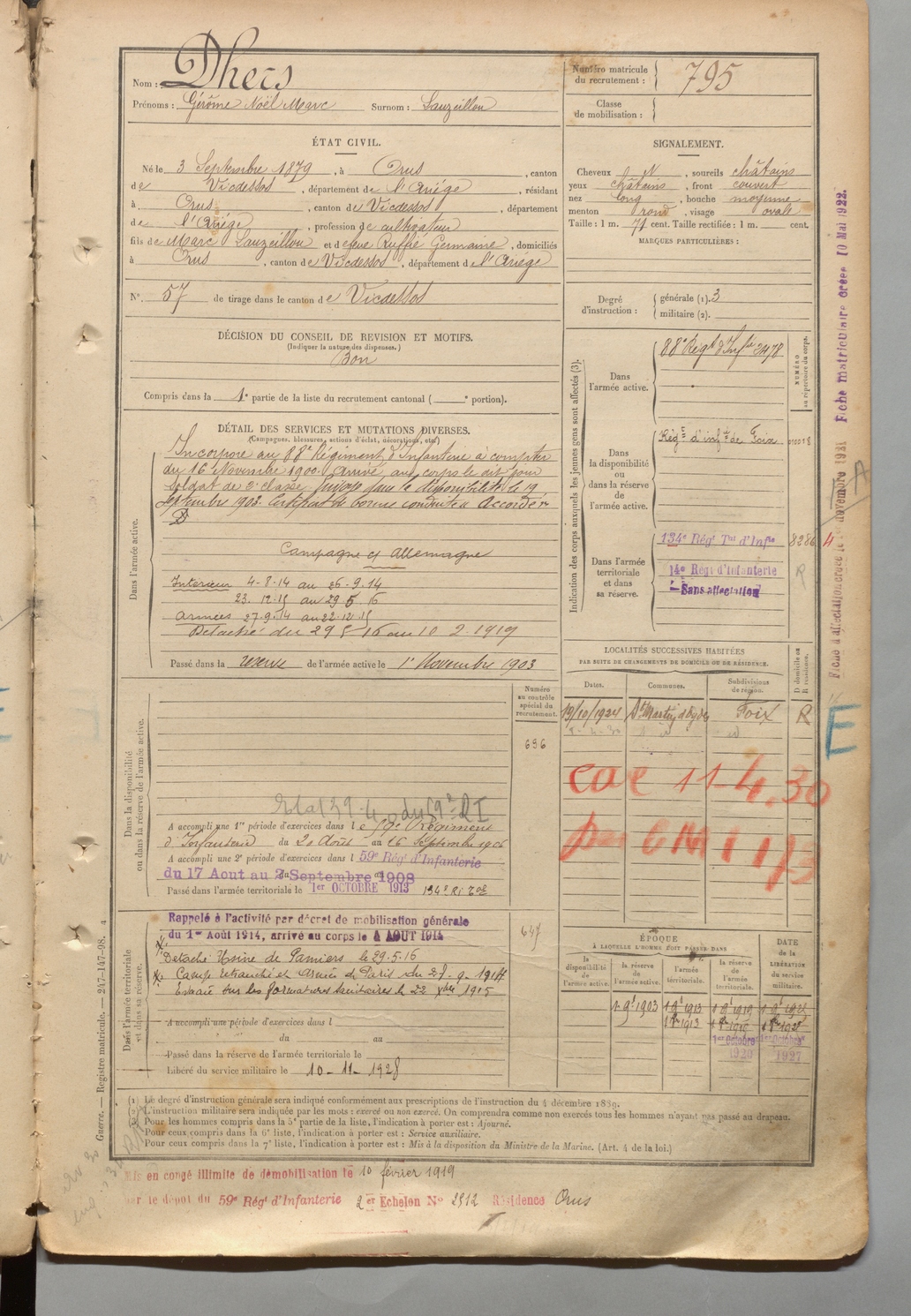 | Dhers | Gérôme Noël Marc dit Lauzeillou | FOIX | 1 R 457 | 1899 | Orus | Orus | 795 |