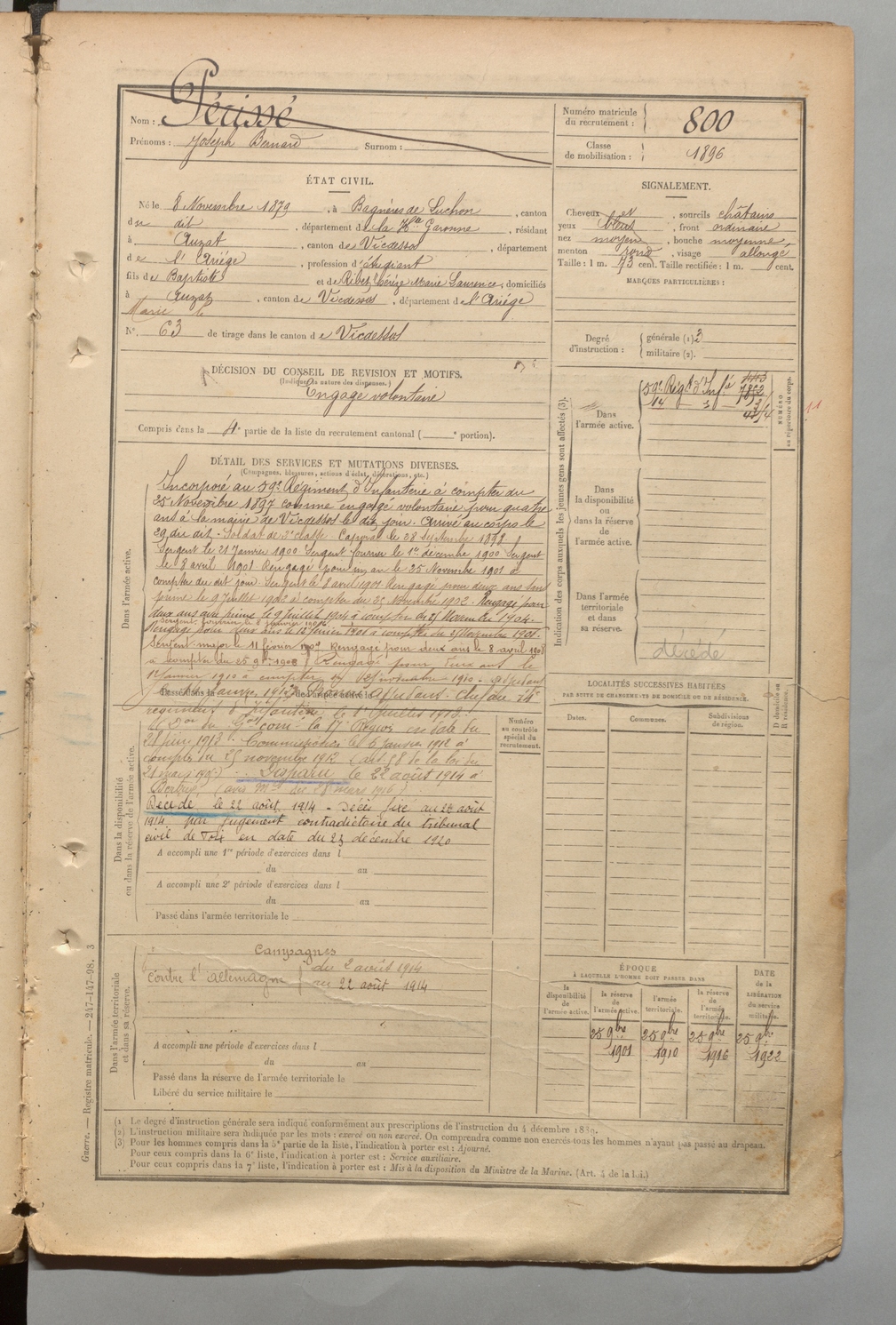 | Périssé | Joseph Bernard | FOIX | 1 R 457 | 1899 | Bagnères de Luchon | Auzat | 800 |