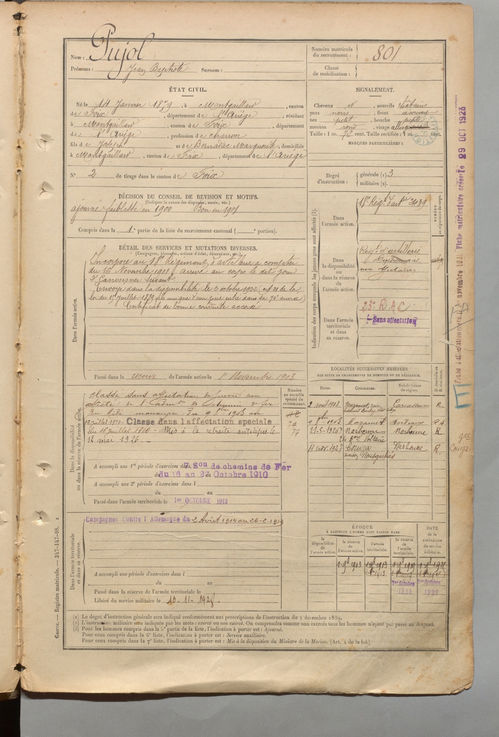 | Pujol | Jean Baptiste | FOIX | 1 R 457 | 1899 | Montgailhard | Montgailhard | 801 |