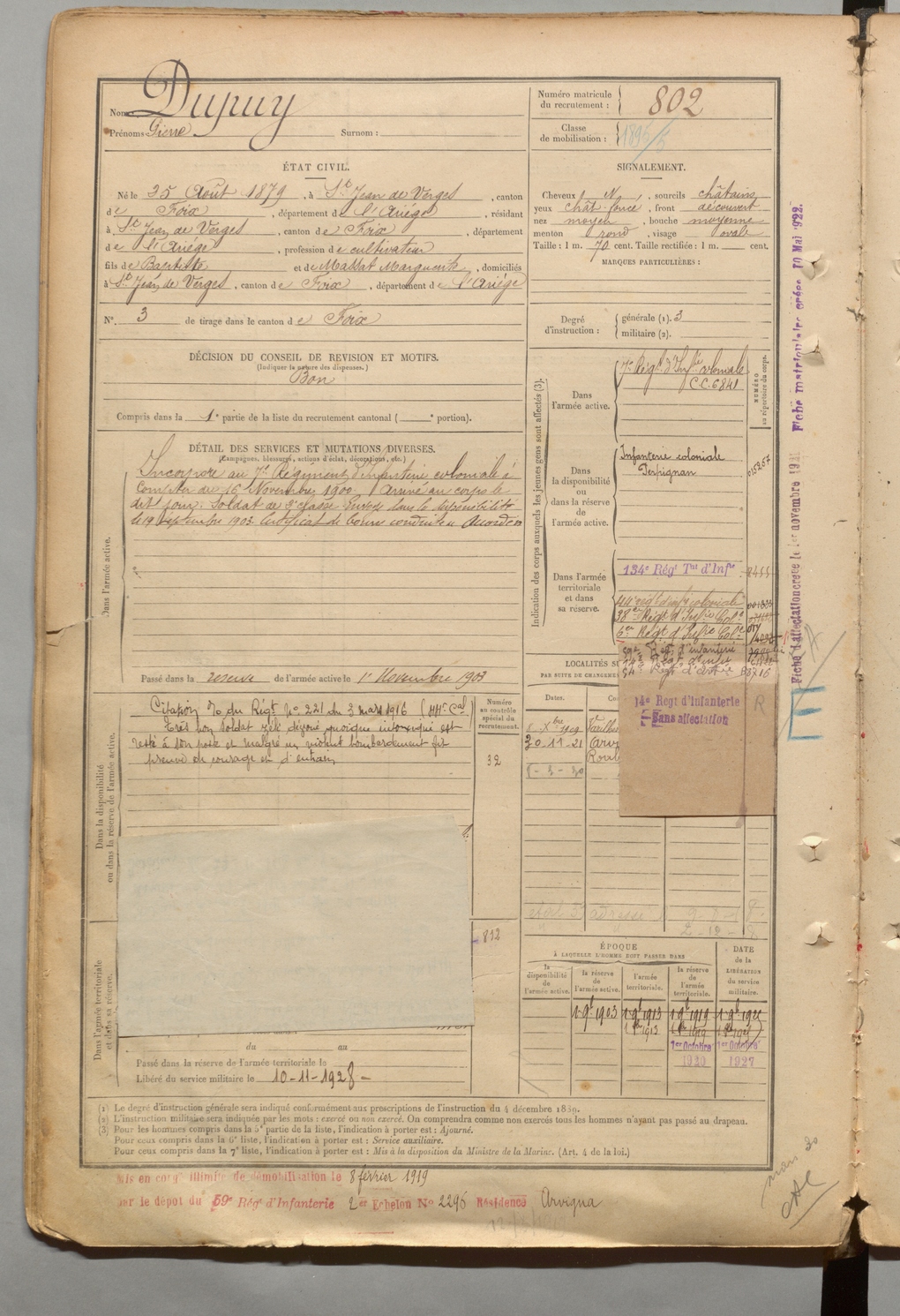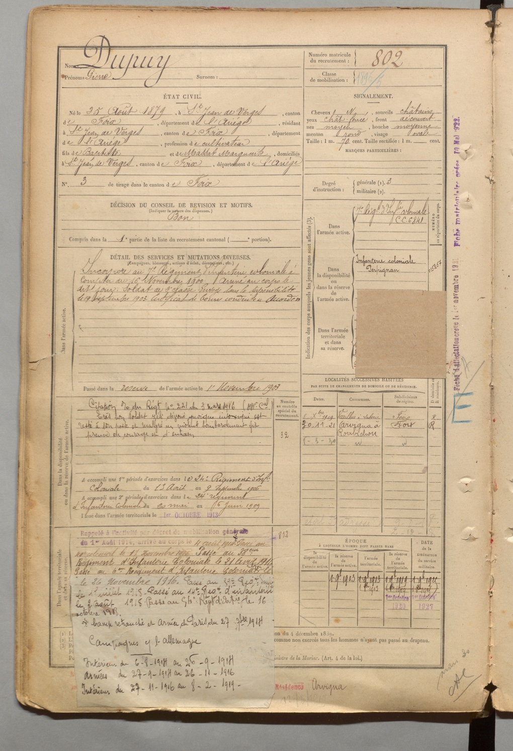 | Dupuy | Pierre | FOIX | 1 R 457 | 1899 | Saint-Jean-de-Verges | Saint-Jean-de-Verges | 802 |
