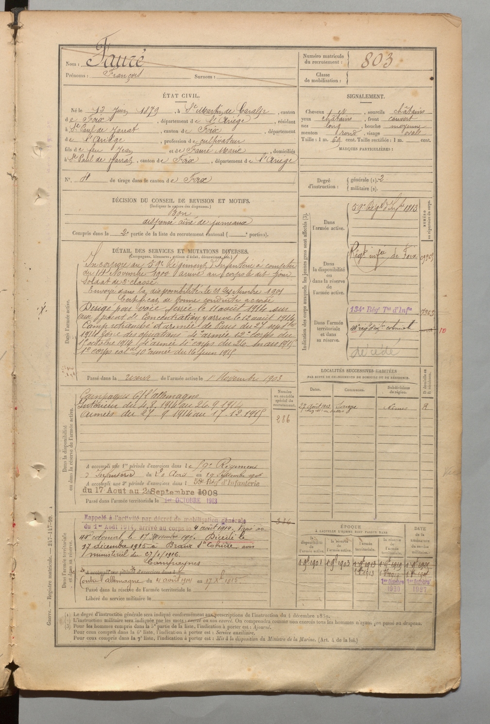 | Fauré | François | FOIX | 1 R 457 | 1899 | Saint-Martin-de-Caralp | Saint-Paul-de-Jarrat | 803 |
