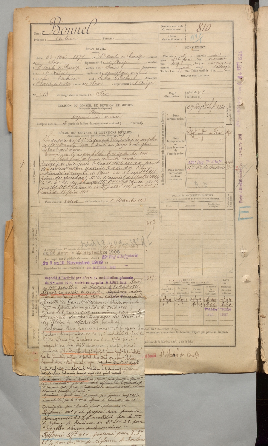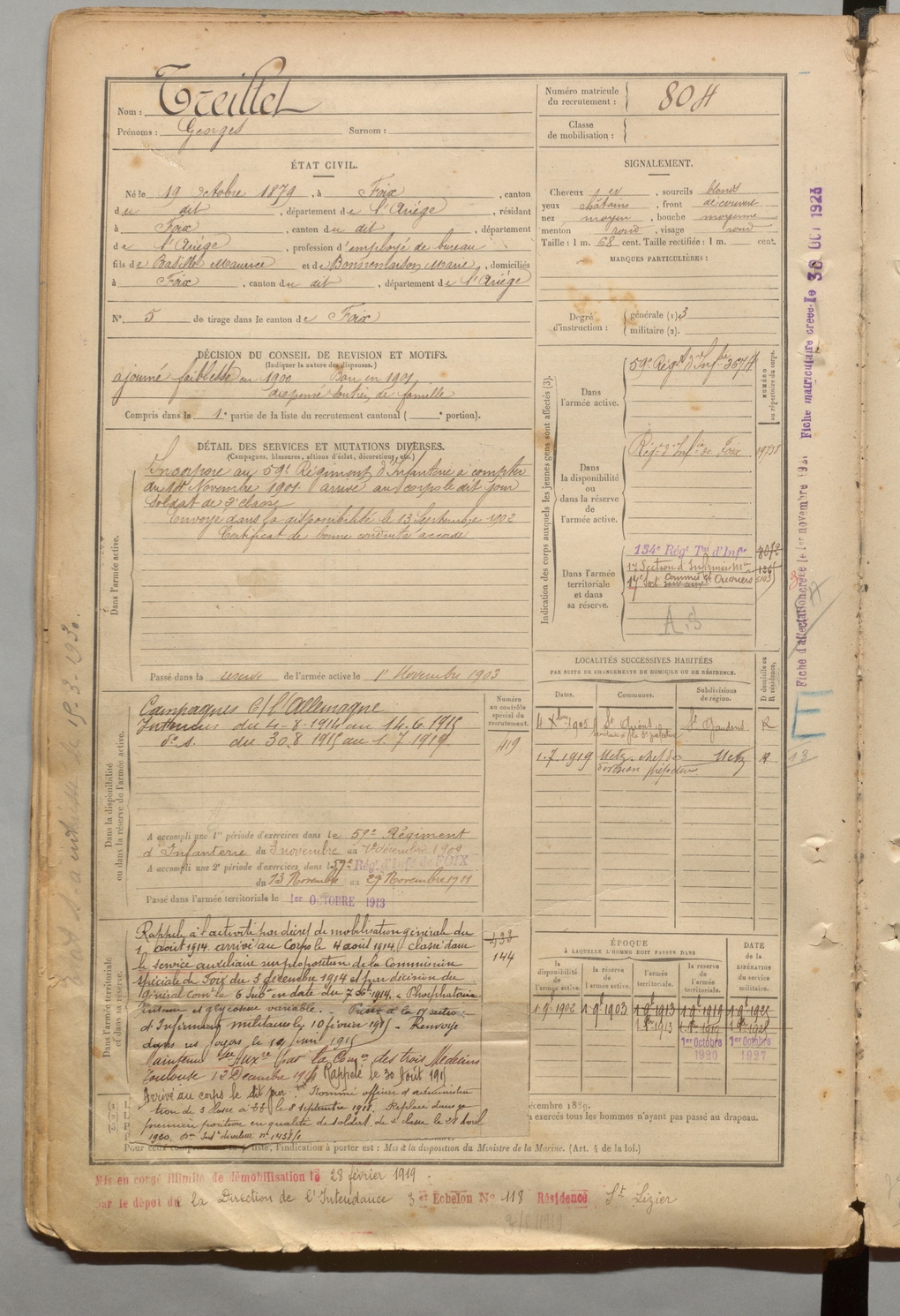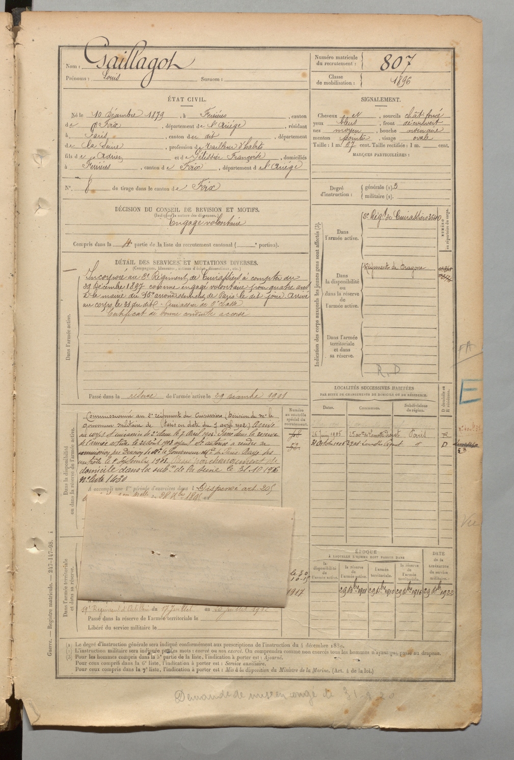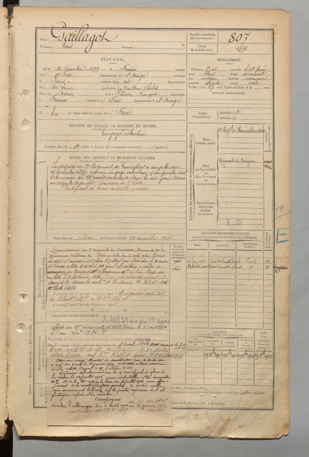 | Gaillagot | Louis | FOIX | 1 R 457 | 1899 | Ferrières | Paris | 807 |