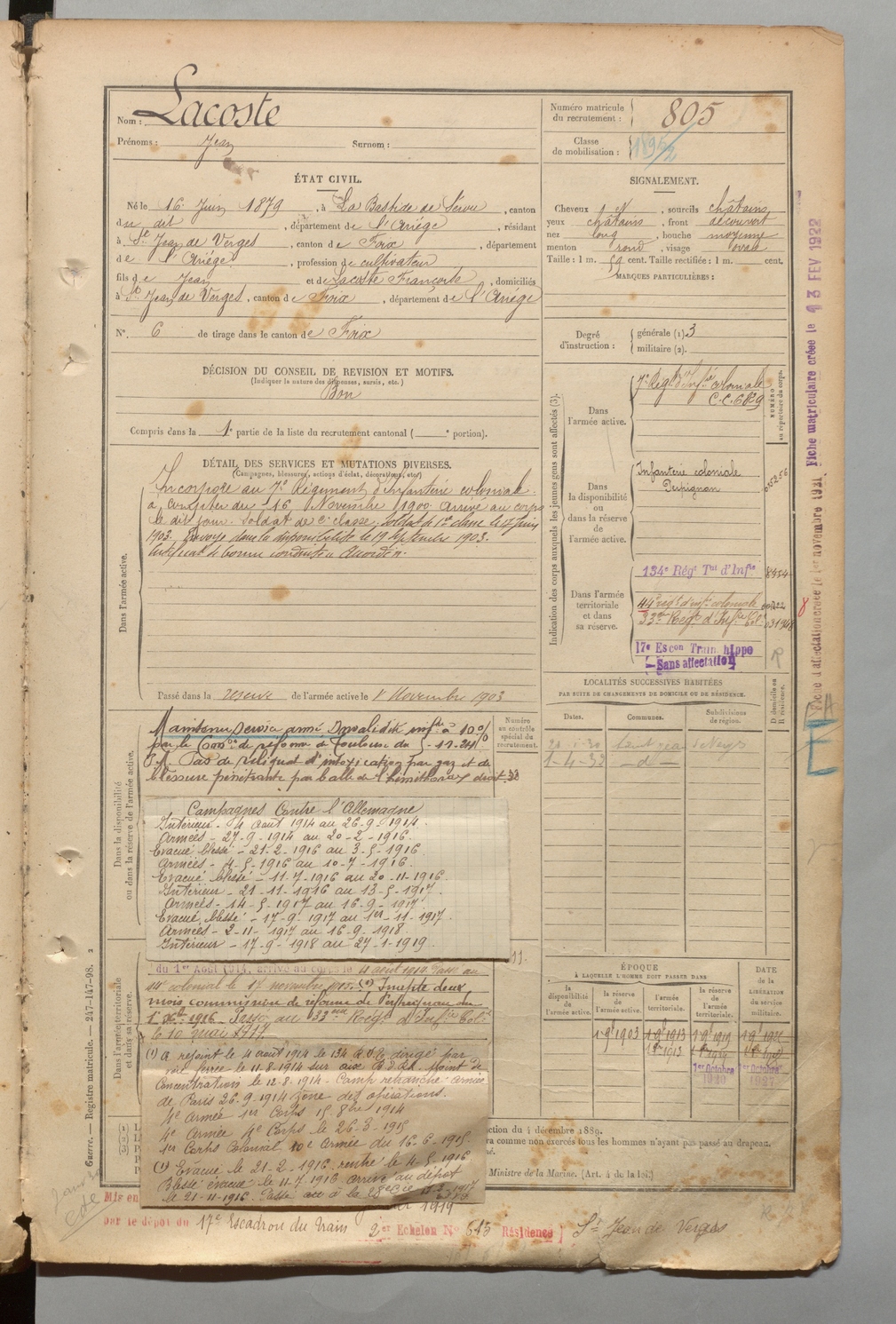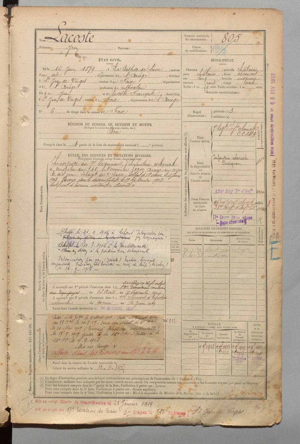 | Lacoste | Jean | FOIX | 1 R 457 | 1899 | Bastide-de-Sérou (La) | Saint-Jean-de-Verges | 805 |