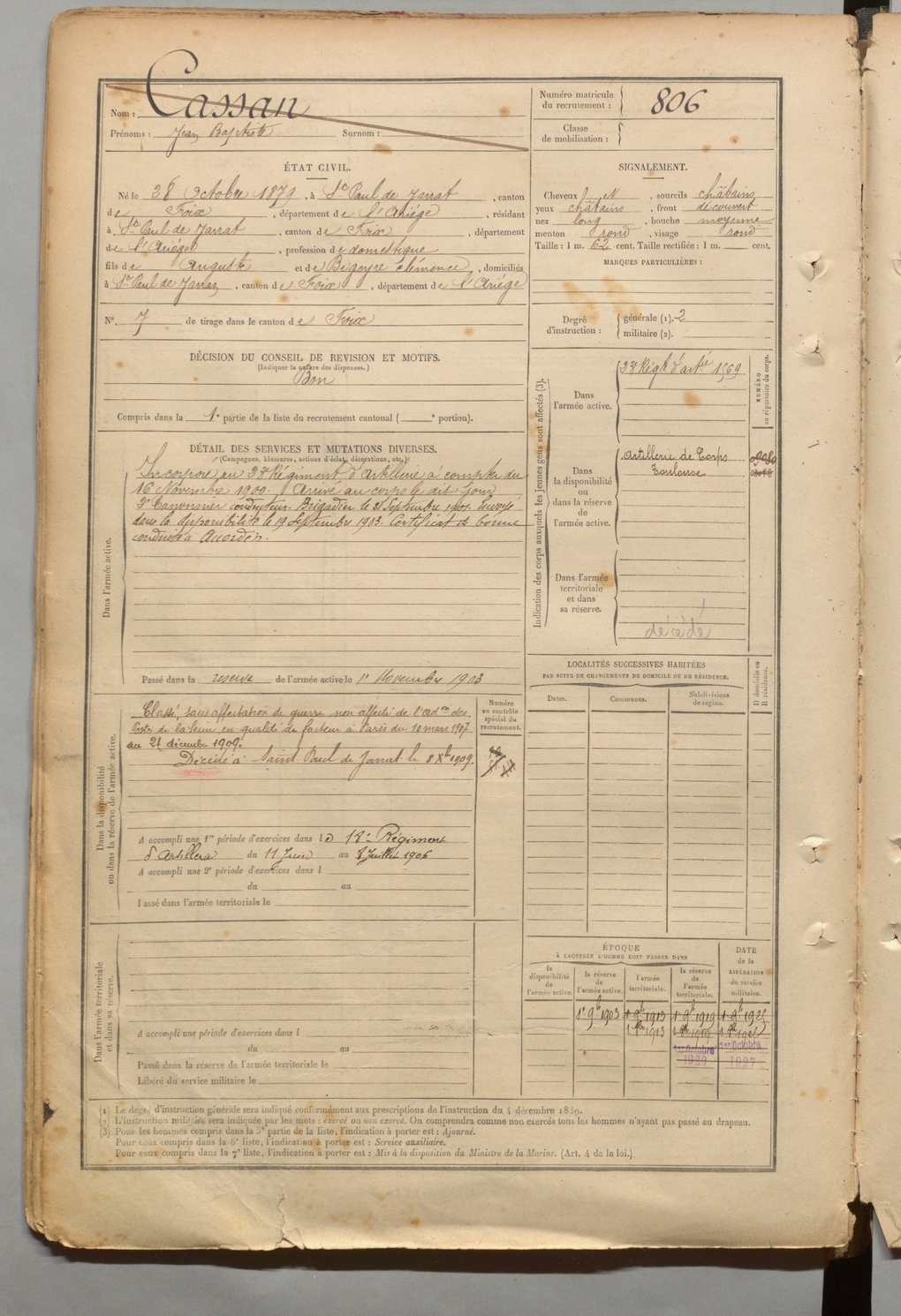 | Cassan | Jean Baptiste | FOIX | 1 R 457 | 1899 | Saint-Paul-de-Jarrat | Saint-Paul-de-Jarrat | 806 |