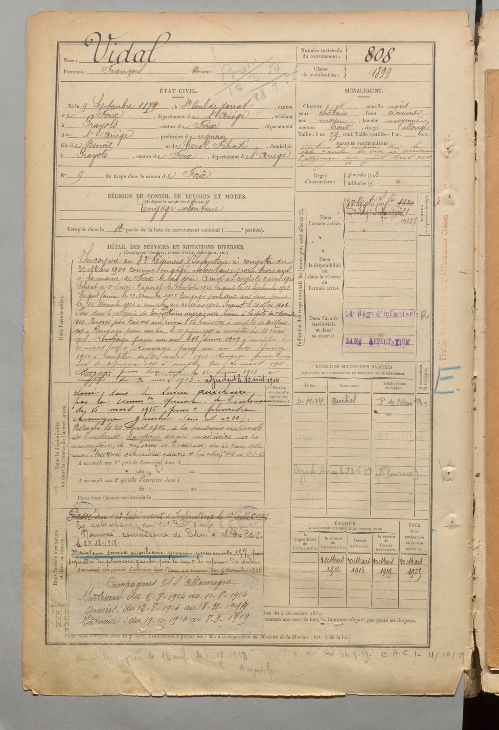 | Vidal | François | FOIX | 1 R 457 | 1899 | Saint-Paul-de-Jarrat | Prayols | 808 |