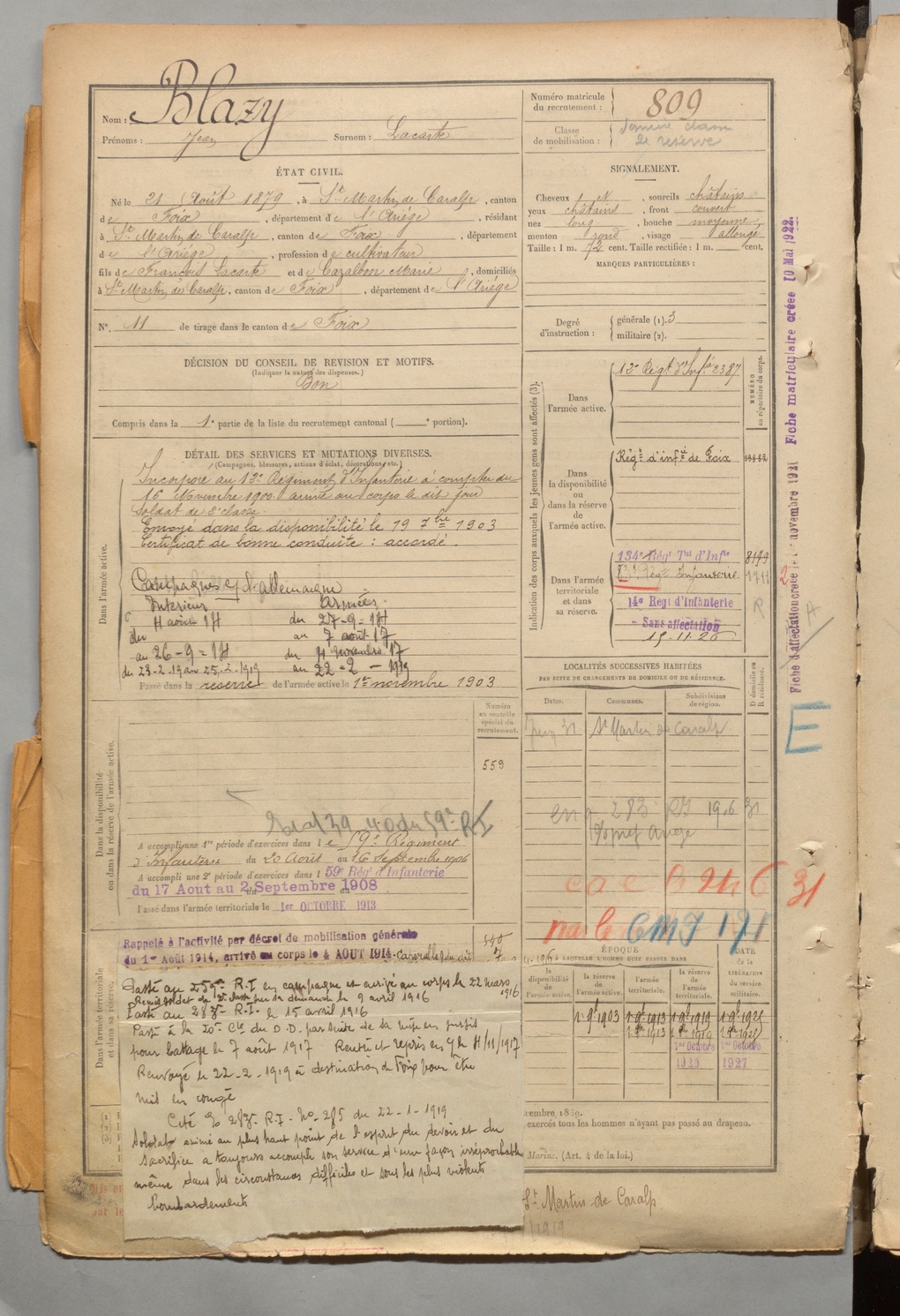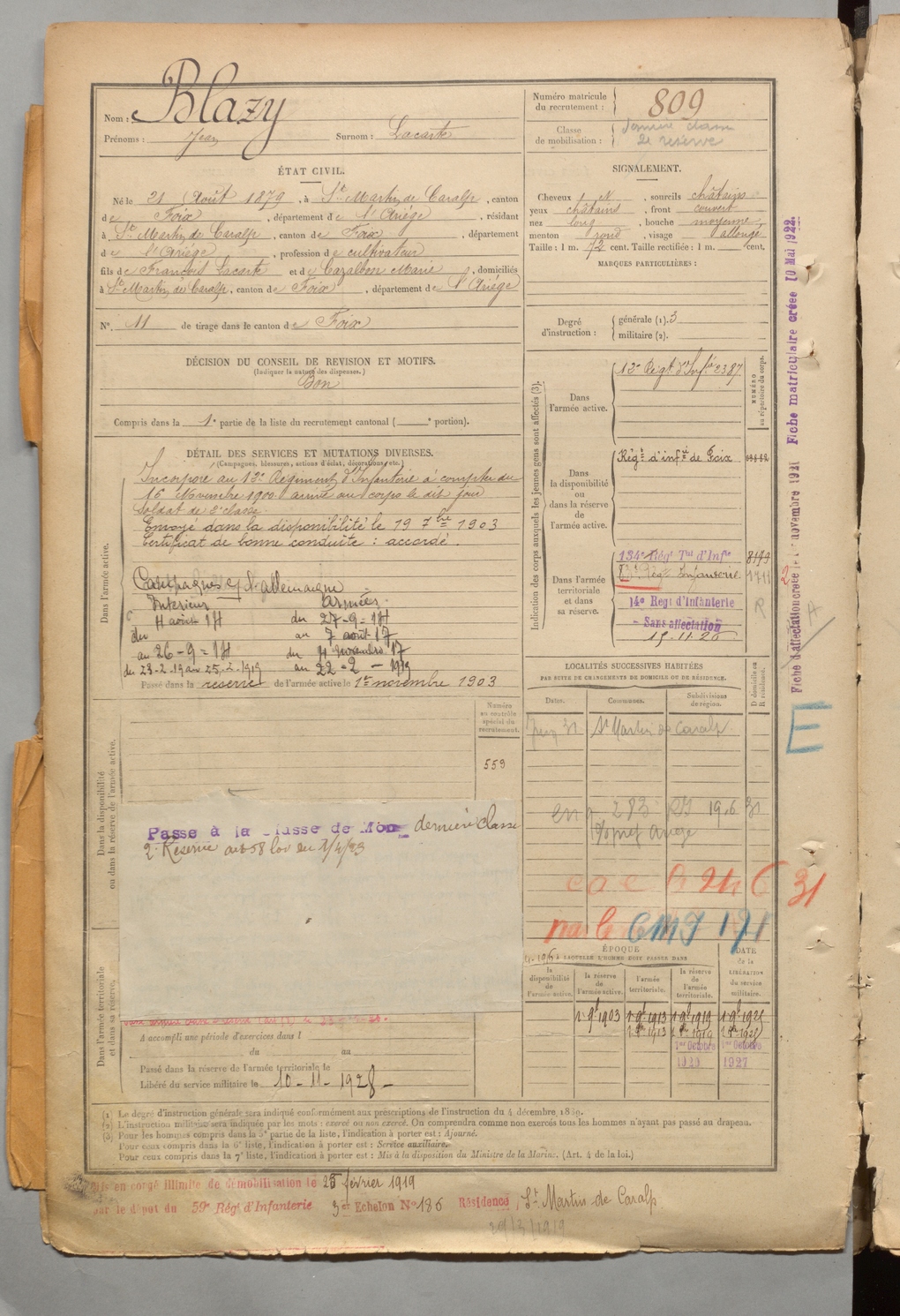 | Blazy | Jean dit Lacarte | FOIX | 1 R 457 | 1899 | Saint-Martin-de-Caralp | Saint-Martin-de-Caralp | 809 |