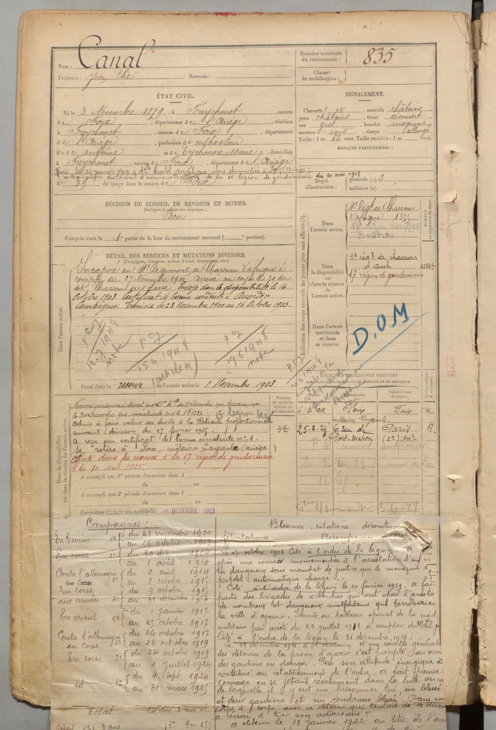 | Canal | Jean Elie | FOIX | 1 R 457 | 1899 | Freychenet | Freychenet | 835 |