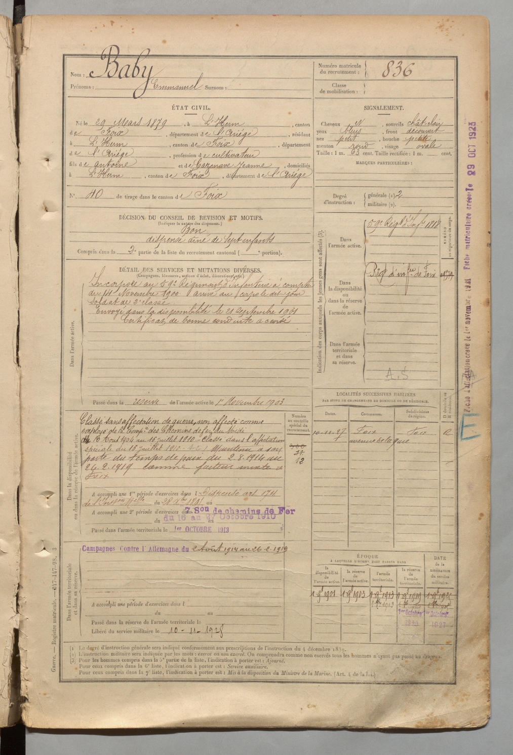 | Baby | Emmanuel | FOIX | 1 R 457 | 1899 | Herm (L') | Herm (L') | 836 |