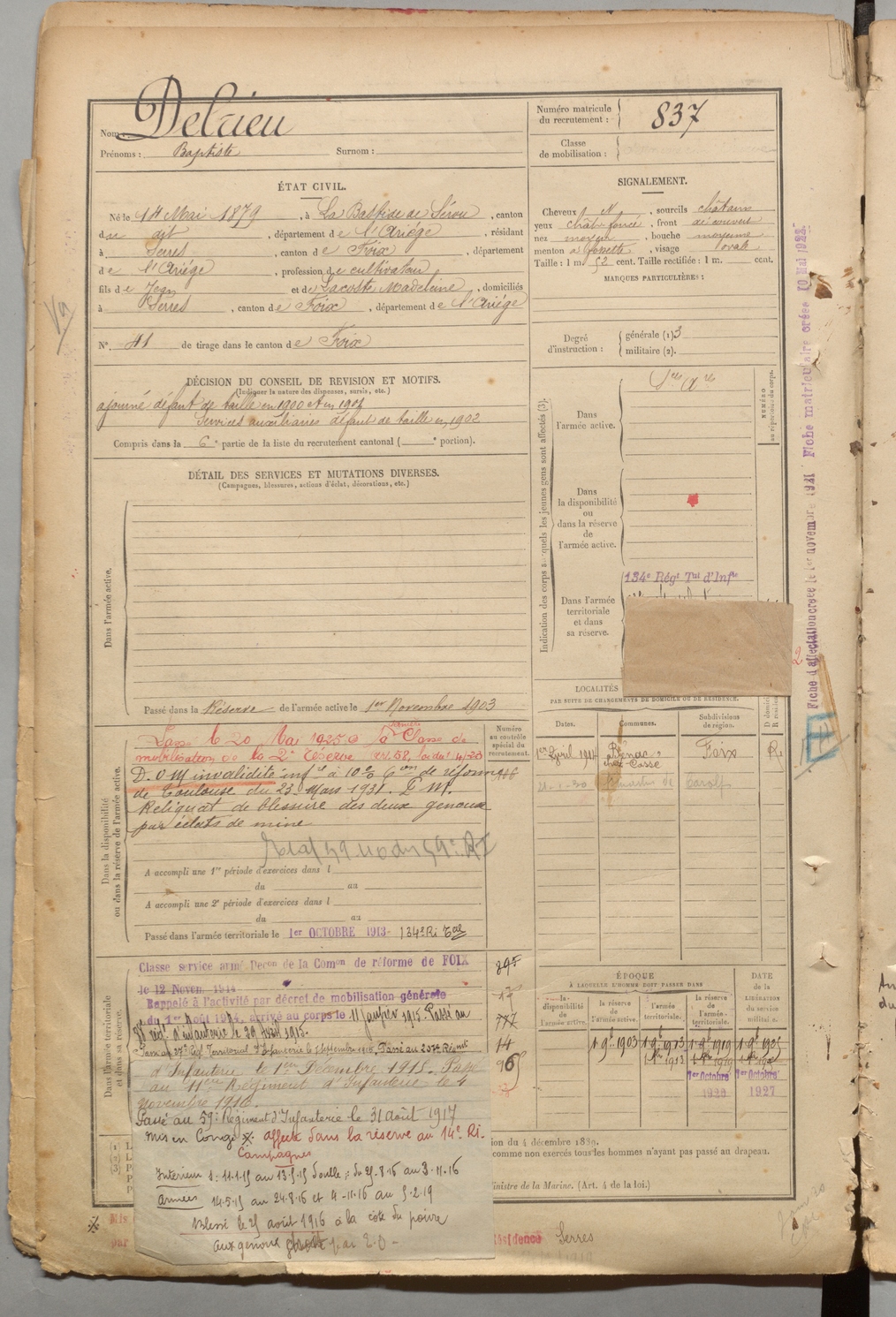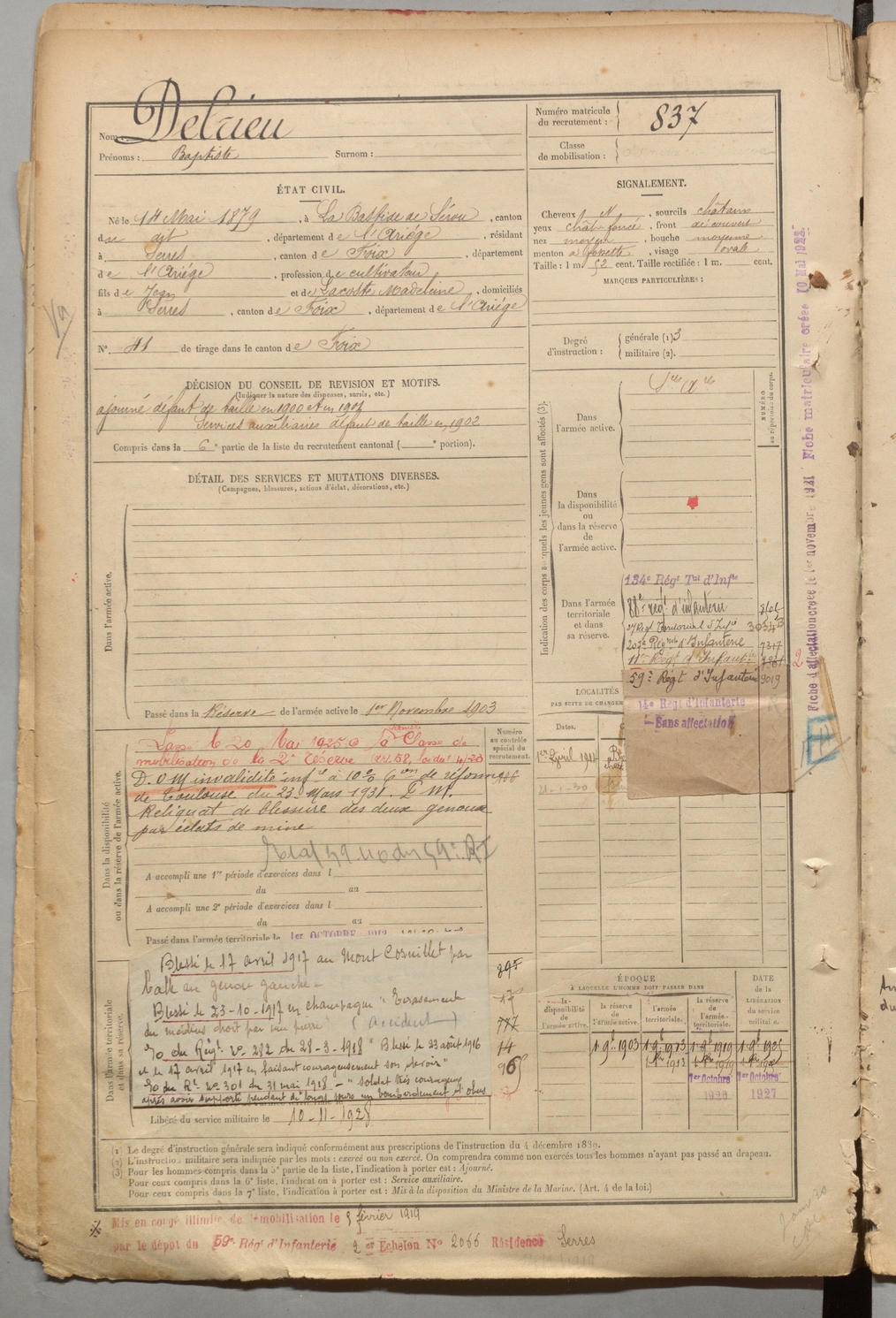 | Delrieu | Baptiste | FOIX | 1 R 457 | 1899 | Bastide-de-Sérou (La) | Serres-sur-Arget | 837 |