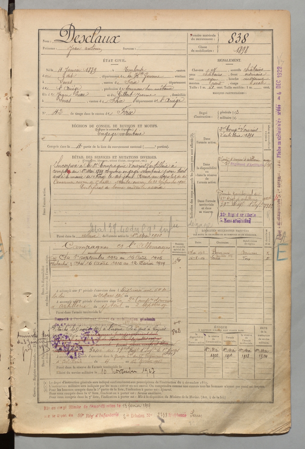 | Desclaux | Jean Antonin | FOIX | 1 R 457 | 1899 | Toulouse | Serres-sur-Arget | 838 |