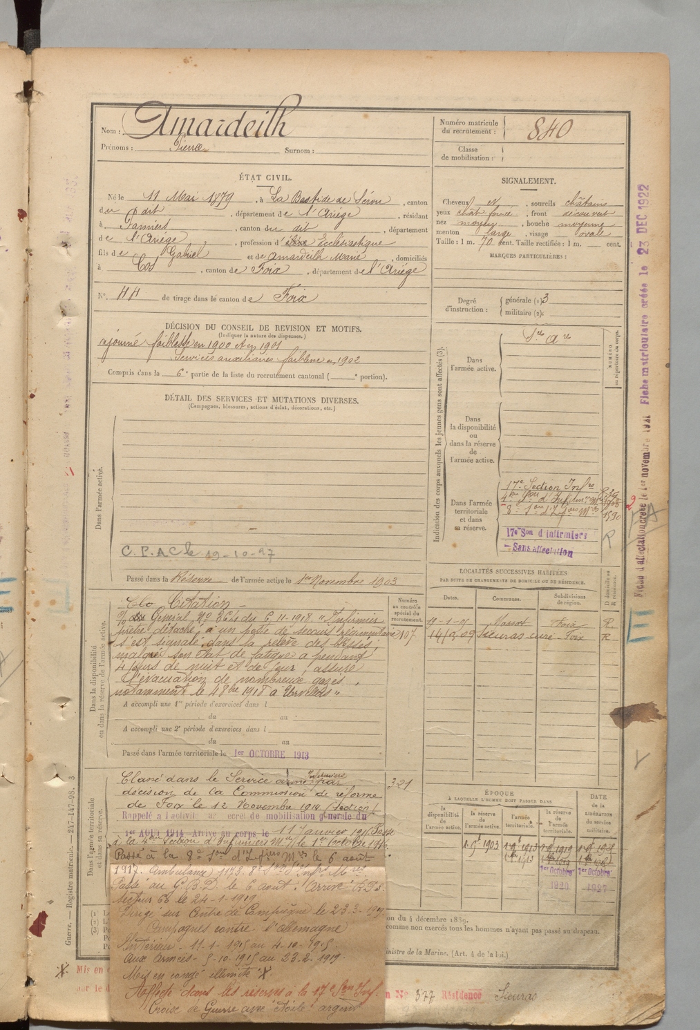 | Amardeilh | Pierre | FOIX | 1 R 457 | 1899 | Bastide-de-Sérou (La) | Pamiers | 840 |