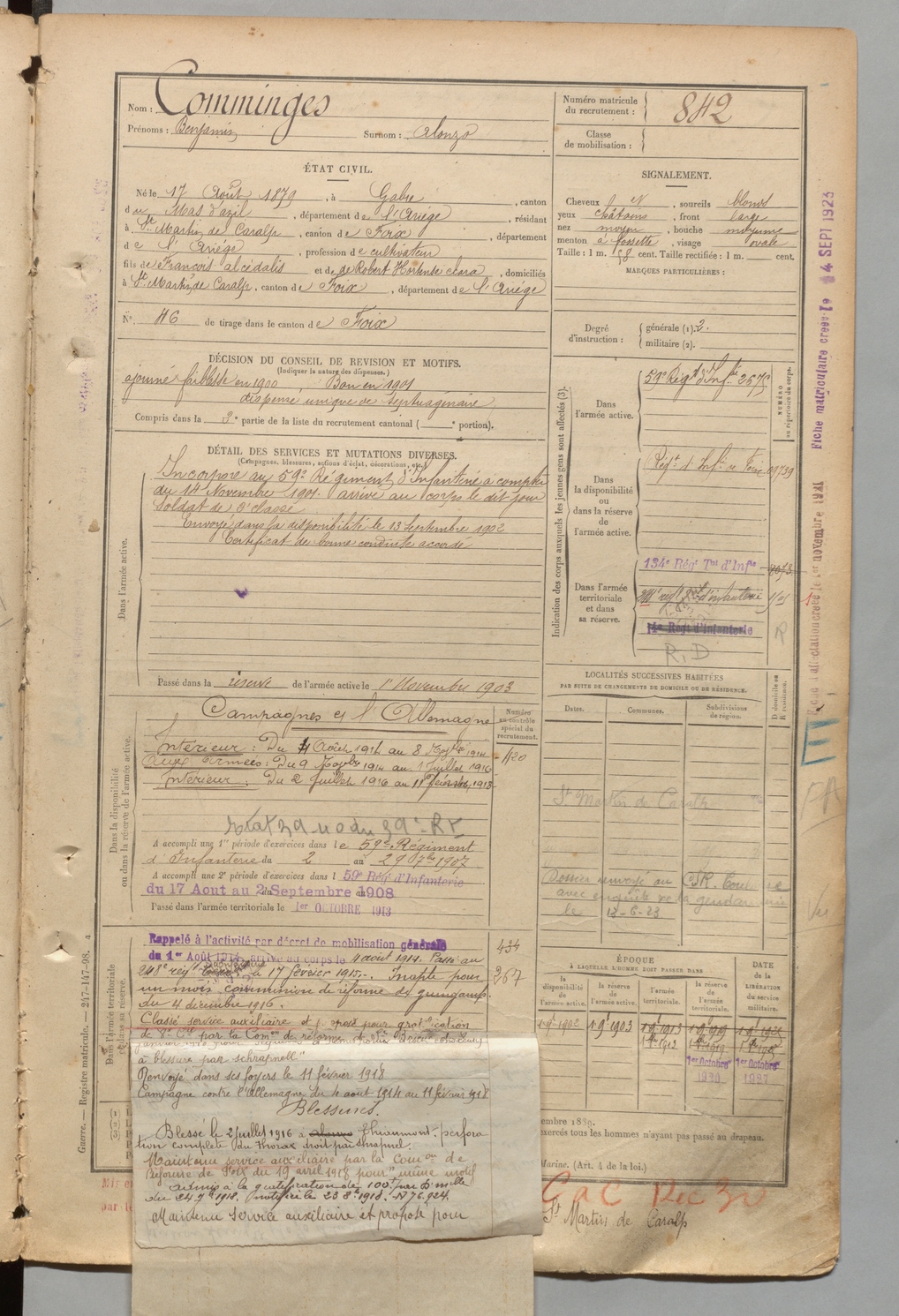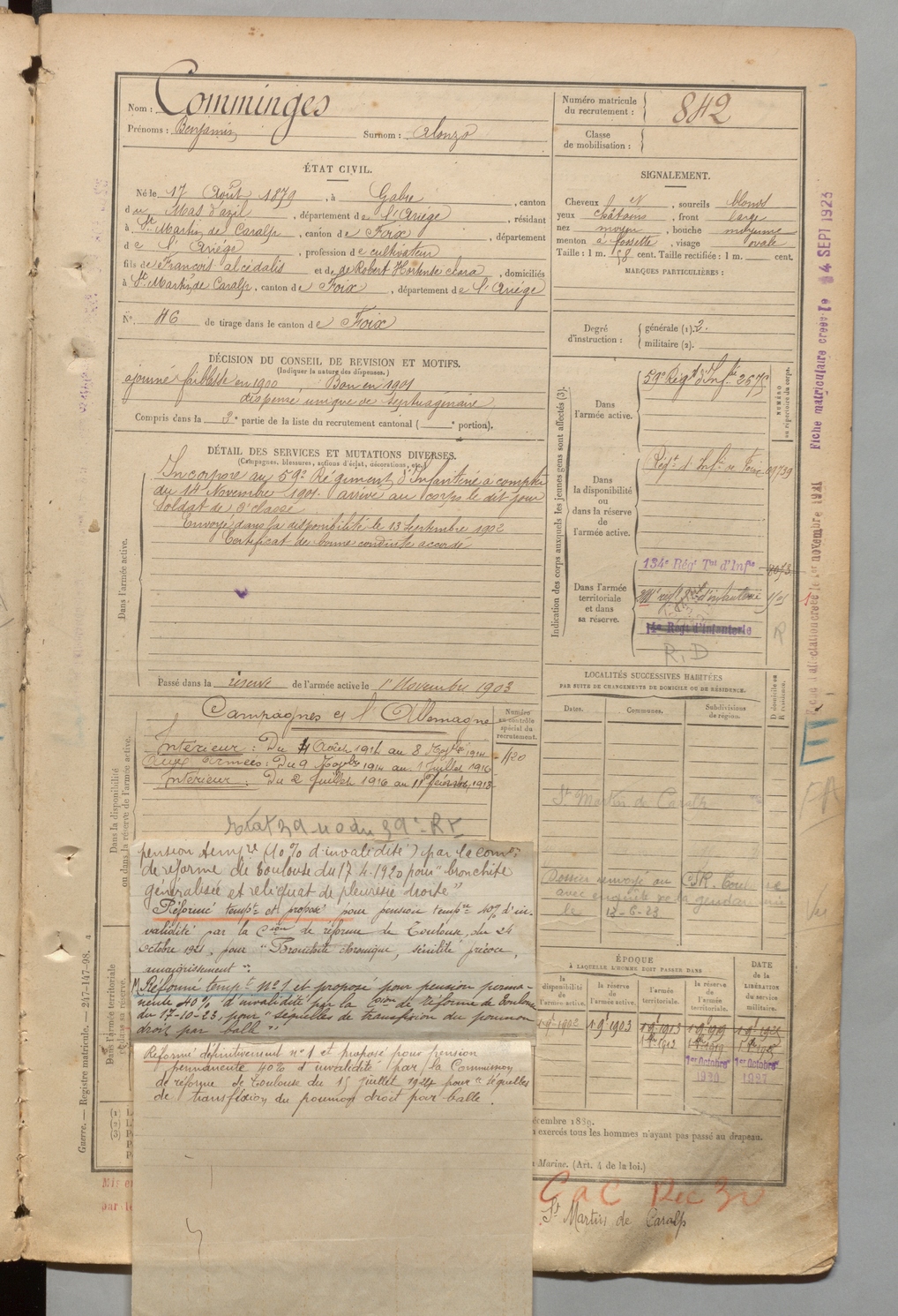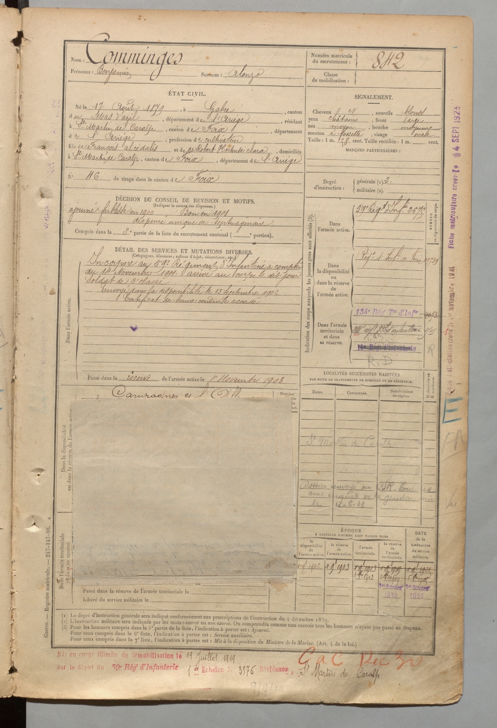 | Comminges | Benjamin dit Alonzo | FOIX | 1 R 457 | 1899 | Gabre | Saint-Martin-de-Caralp | 842 |