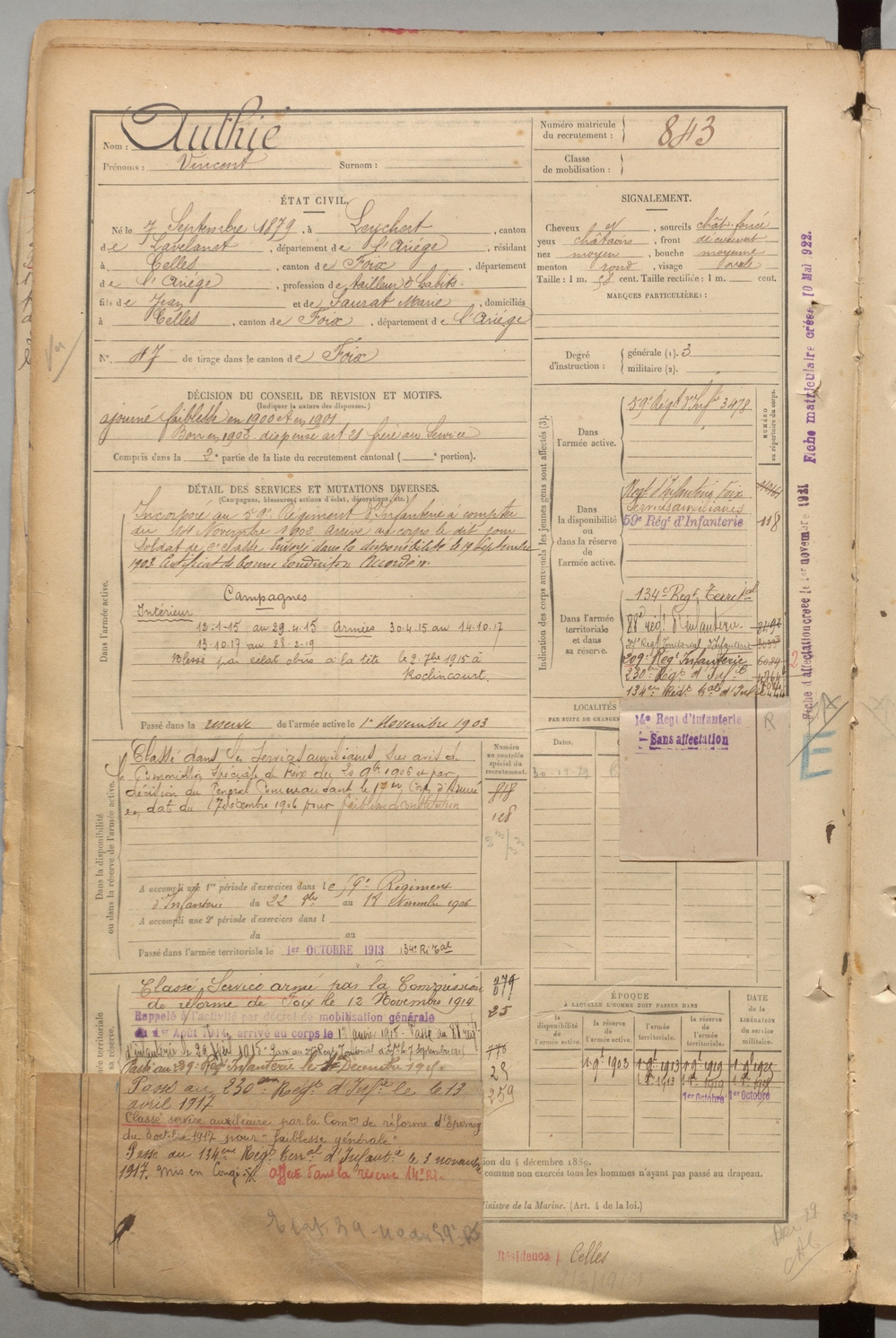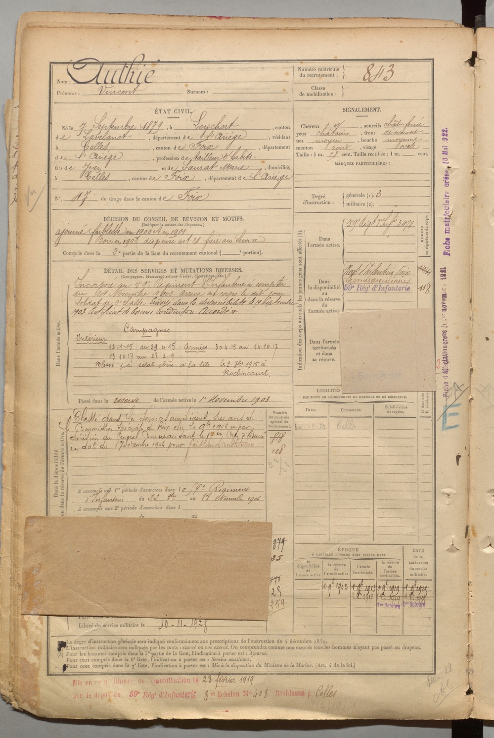 | Authié | Vincent | FOIX | 1 R 457 | 1899 | Leychert | Celles | 843 |