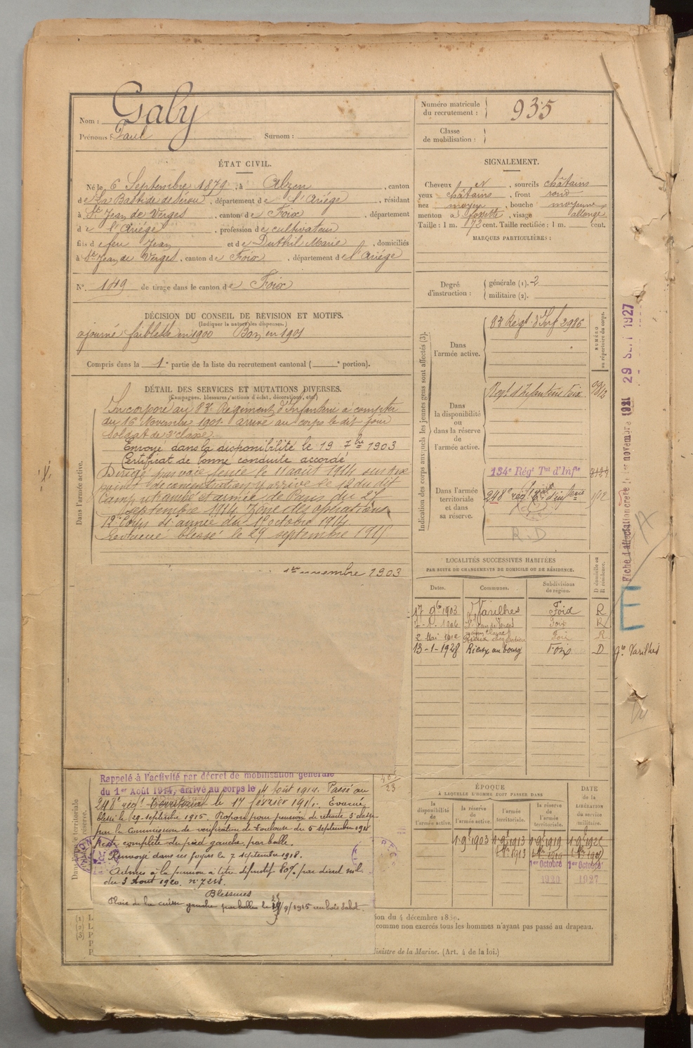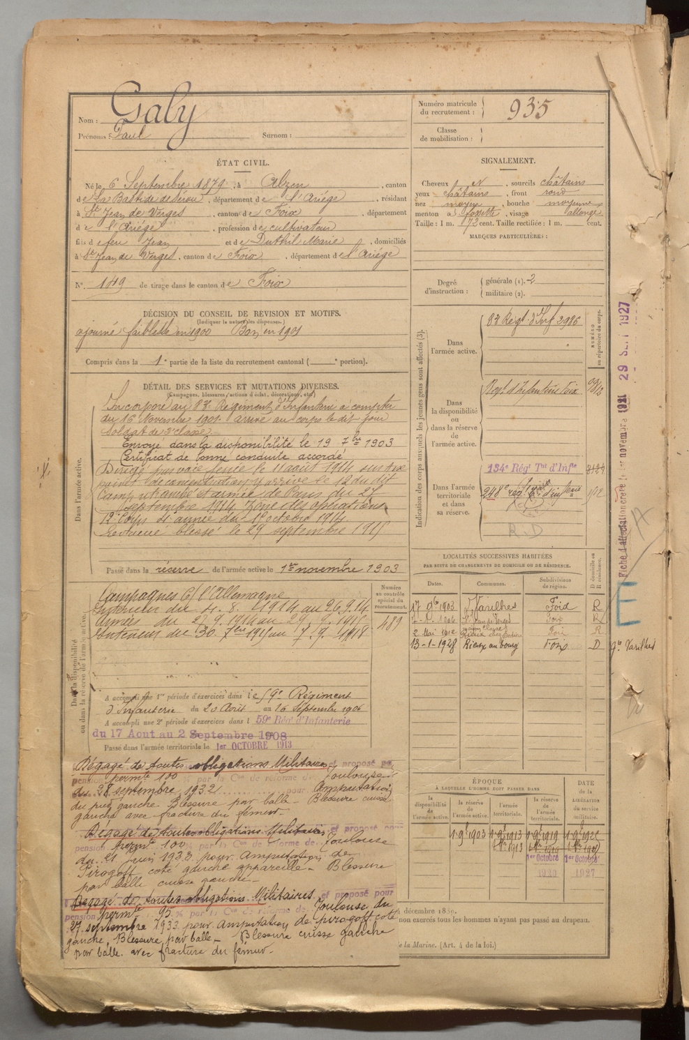 | Galy | Paul | FOIX | 1 R 457 | 1899 | Alzen | Saint-Jean-de-Verges | 935 |
