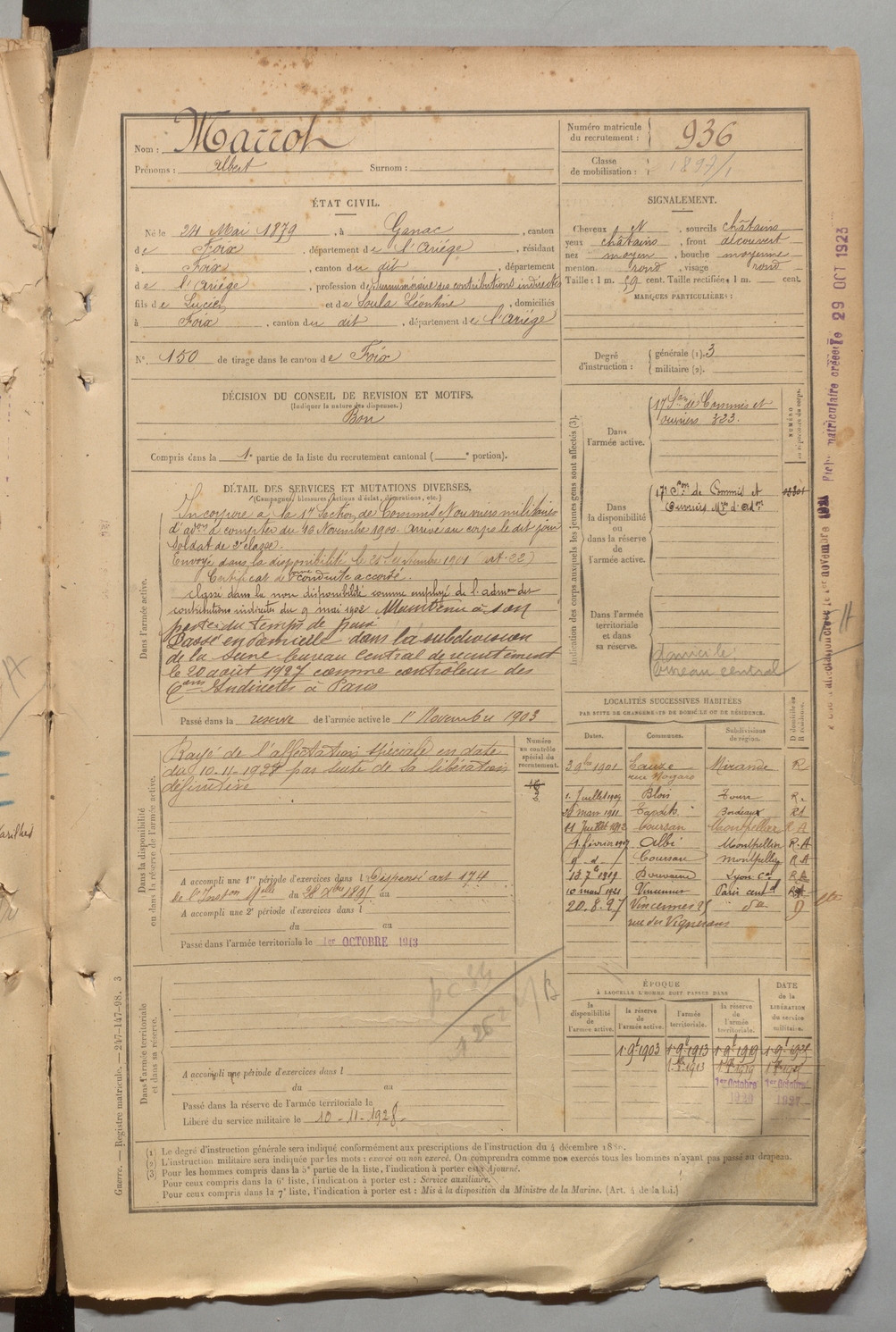 | Marrot | Albert | FOIX | 1 R 457 | 1899 | Ganac | Foix | 936 |