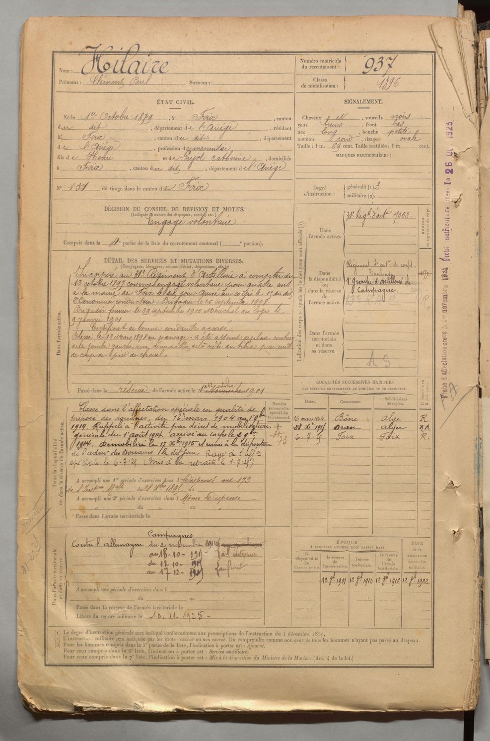 | Hilaire | Clément Paul | FOIX | 1 R 457 | 1899 | Foix | Foix | 937 |