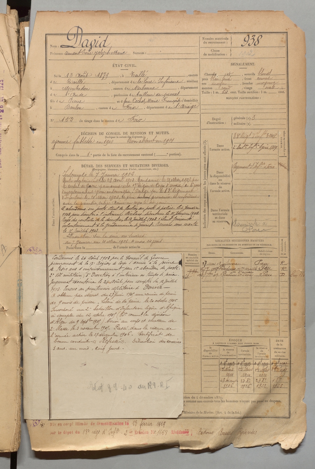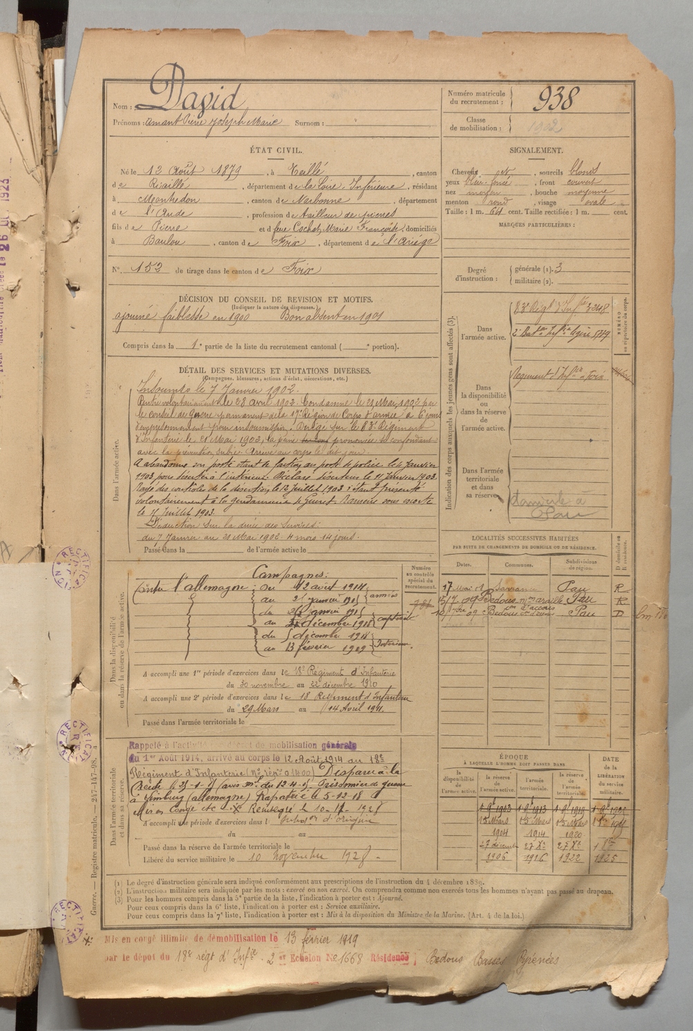 | David | Amant Pierre Joseph Marie | FOIX | 1 R 457 | 1899 | Teilhet | Montredon | 938 |