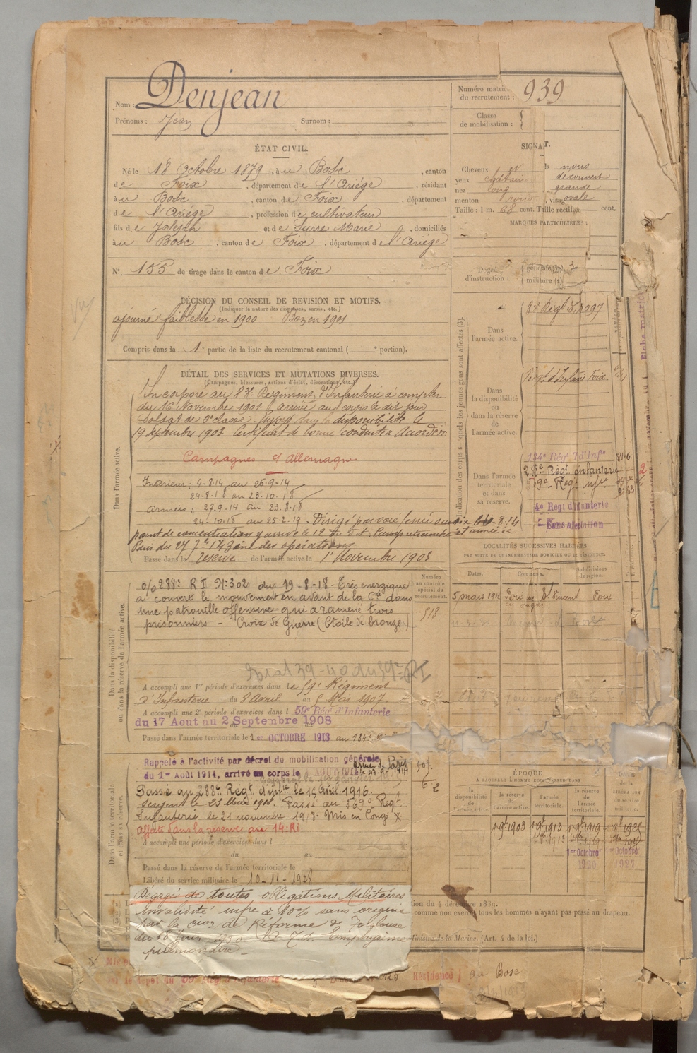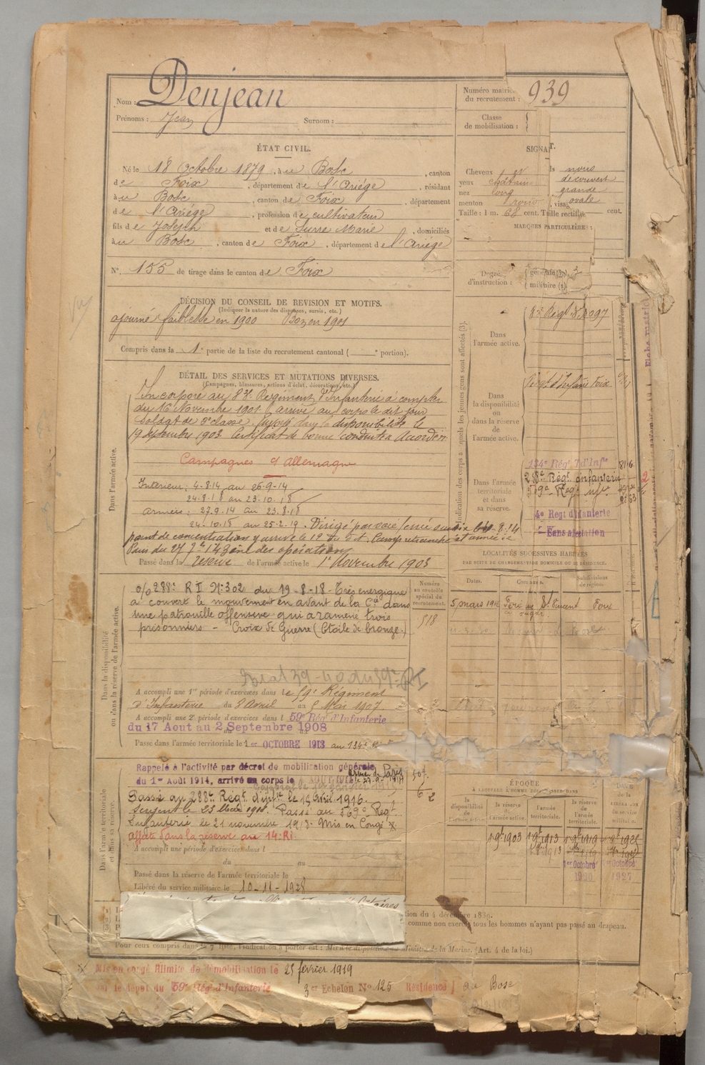 | Denjean | Pierre | FOIX | 1 R 457 | 1899 | Herm (L') | ??? | 940 |