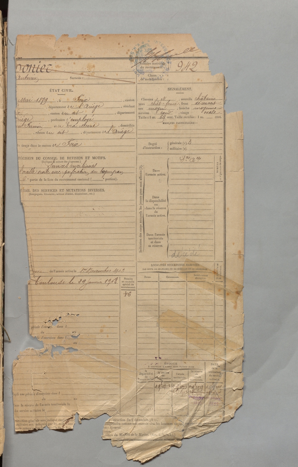| Monier | Antonin | FOIX | 1 R 457 | 1899 | Foix | 942 |