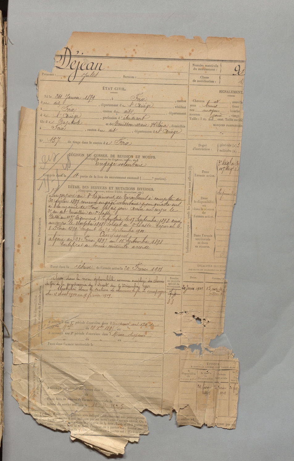 | Déjean | Jules | FOIX | 1 R 457 | 1899 | Foix | Foix | 943 |