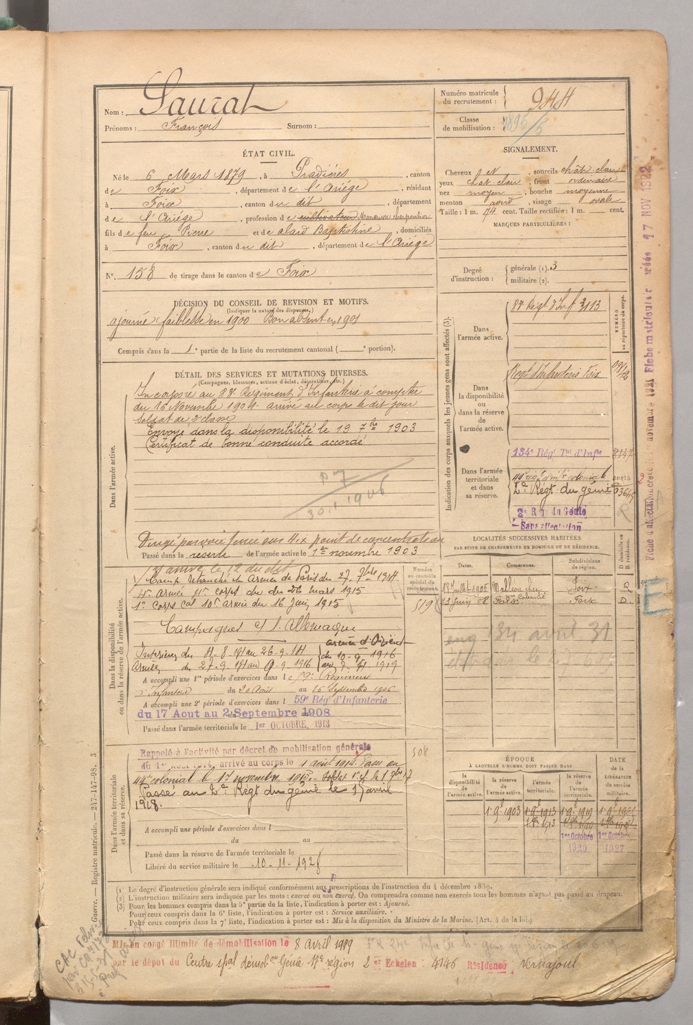| Saurat | François | FOIX | 1 R 458 | 1899 | Pradières | Foix | 944 |