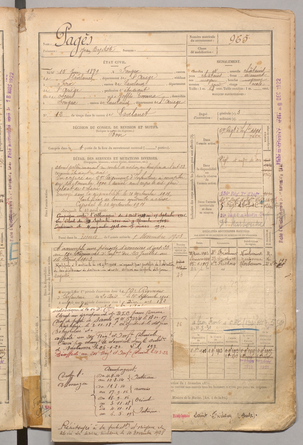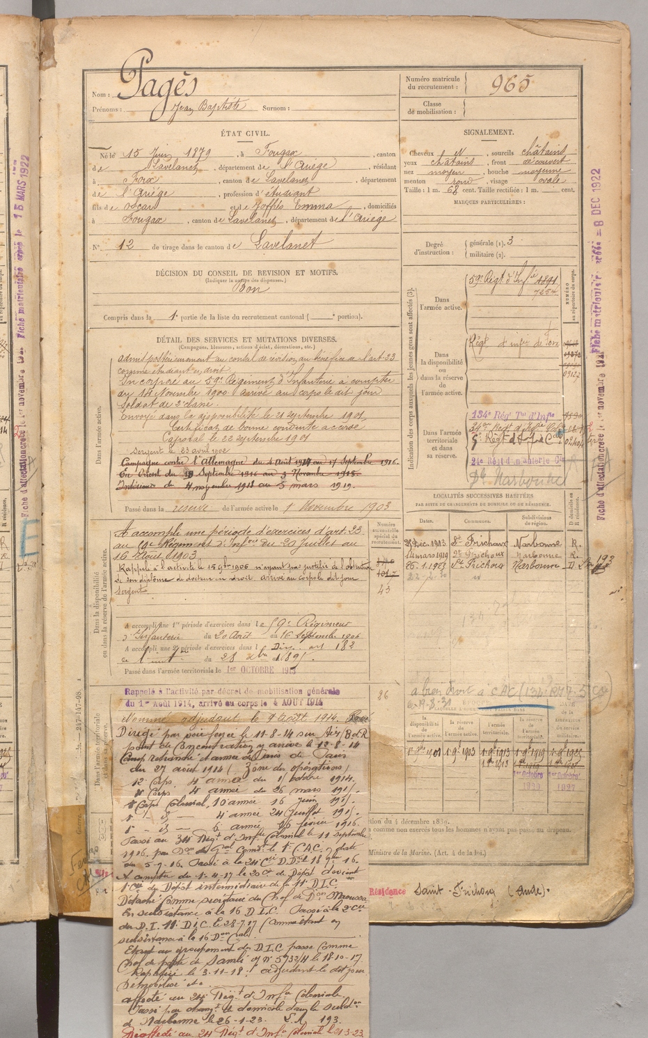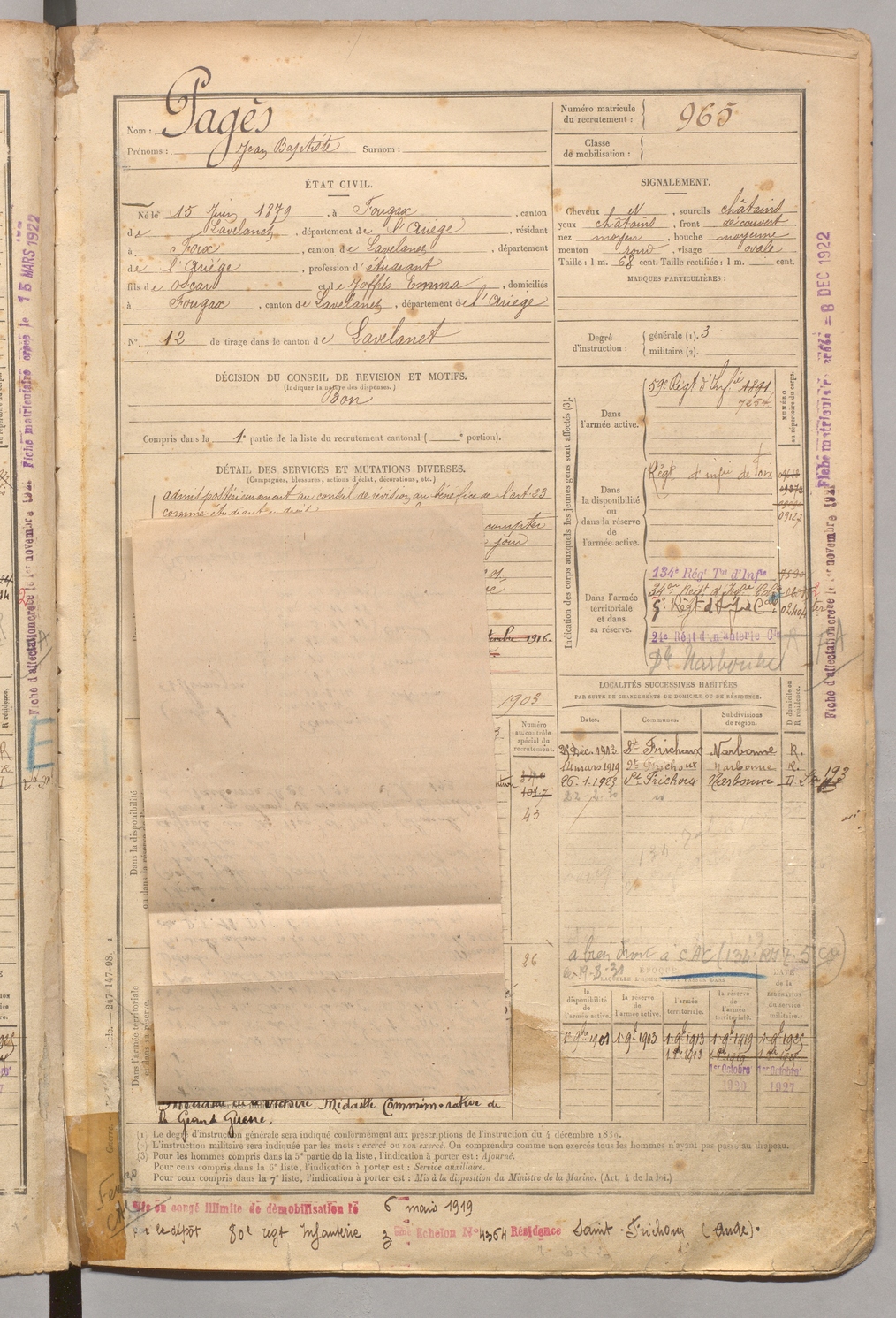 | Pagès | Jean Baptiste | FOIX | 1 R 458 | 1899 | Fougax-et-Barrineuf | Foix | 965 |