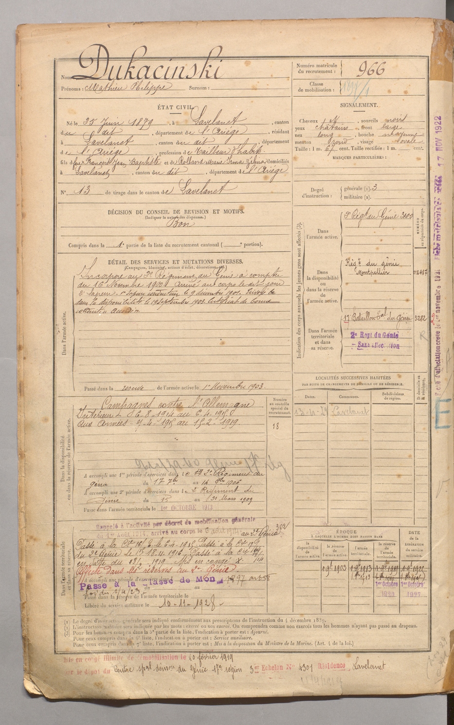 | Dukacinski | Mathieu Philippe | FOIX | 1 R 458 | 1899 | Lavelanet | Lavelanet | 966 |