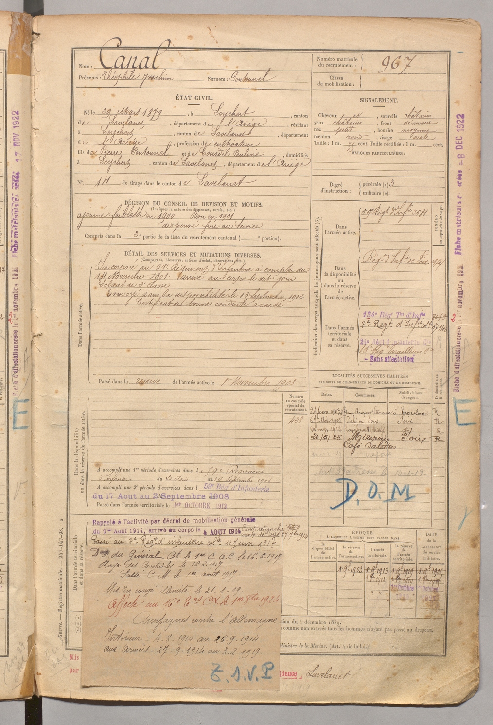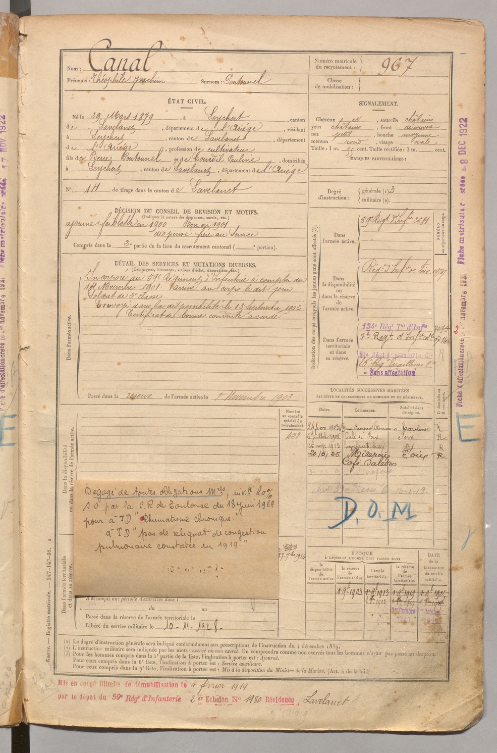 | Canal | Théophile Joachim dit Poutounel | FOIX | 1 R 458 | 1899 | Leychert | Leychert | 967 |