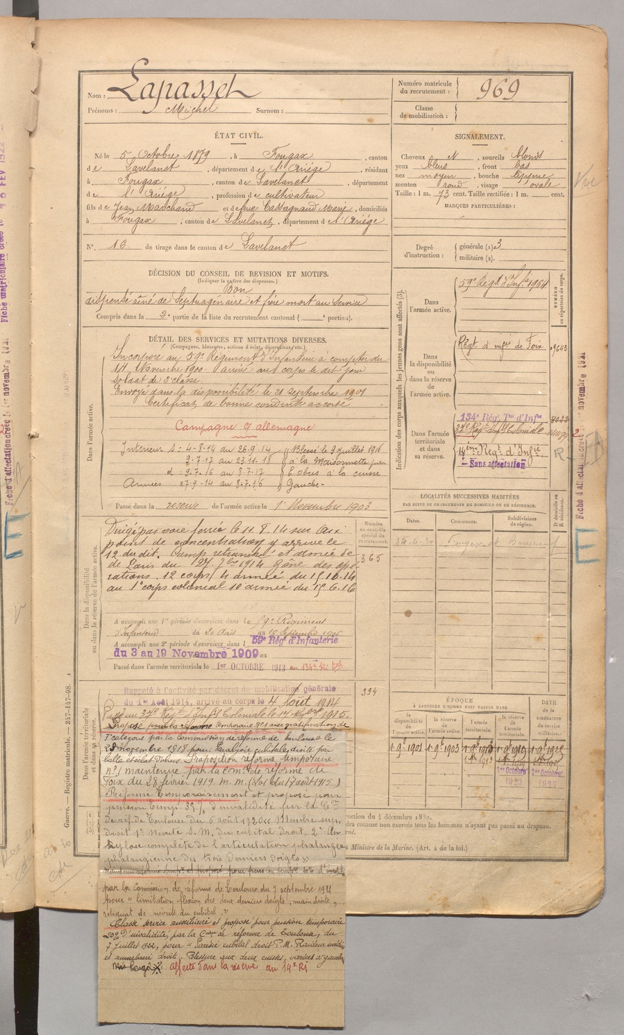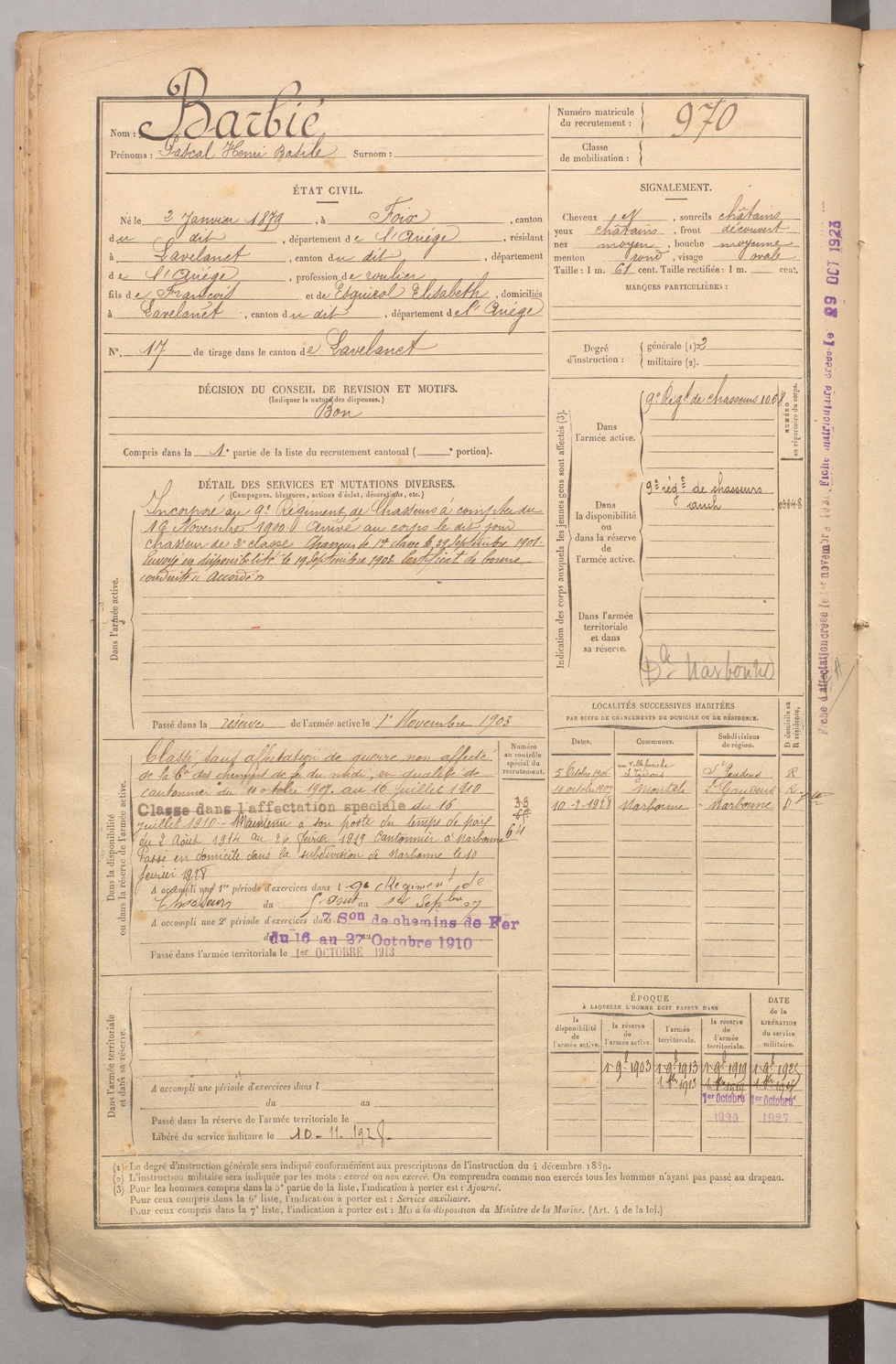 | Barbié | Pascal Henri Basile | FOIX | 1 R 458 | 1899 | Foix | Lavelanet | 970 |