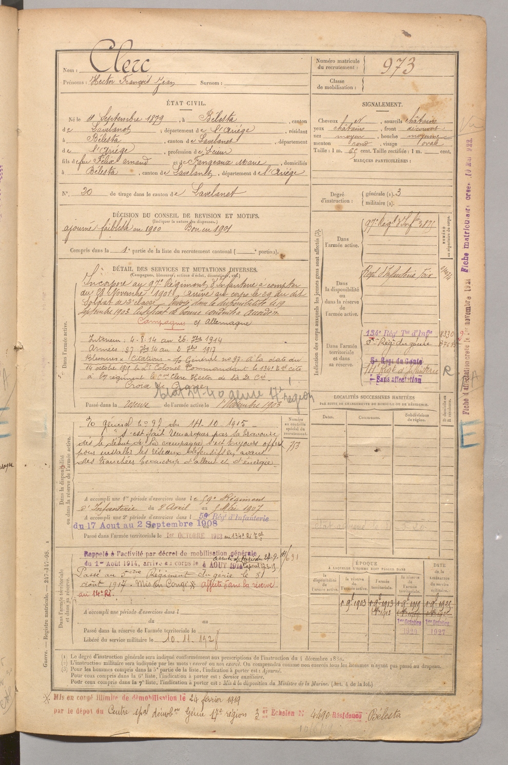 | Clerc | Hector François Jean | FOIX | 1 R 458 | 1899 | Bélesta | Bélesta | 973 |
