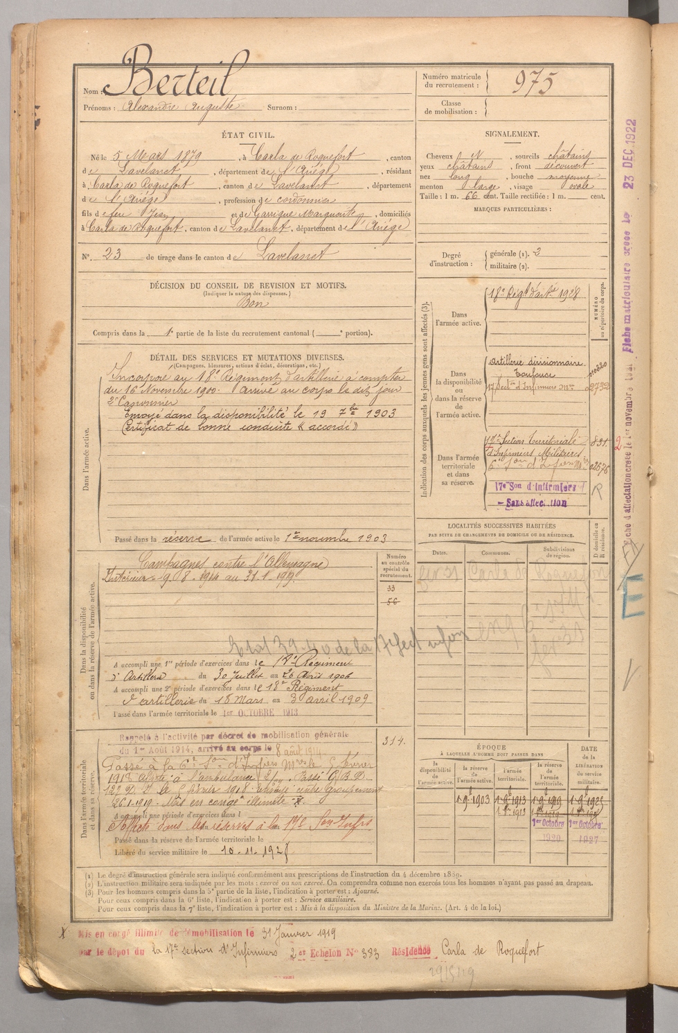 | Berteil | Alexandre Auguste | FOIX | 1 R 458 | 1899 | Carla-de-Roquefort (Le) | Carla-de-Roquefort (Le) | 975 |
