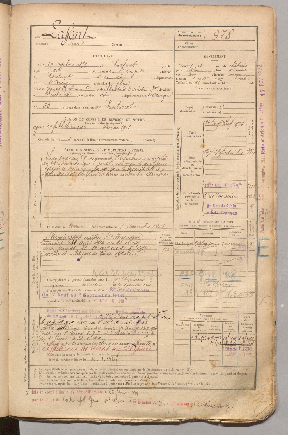| Laffont | Pierre | FOIX | 1 R 458 | 1899 | Lavelanet | Lavelanet | 978 |
